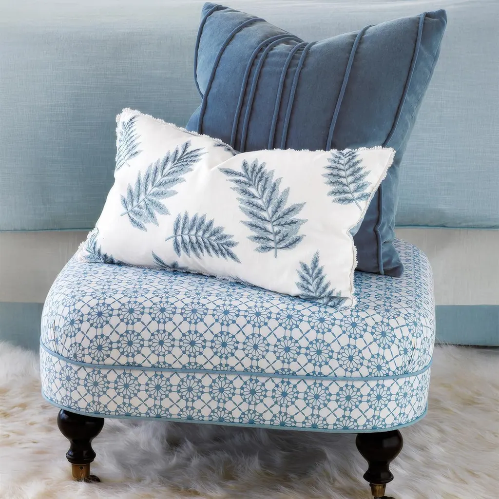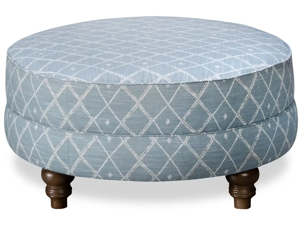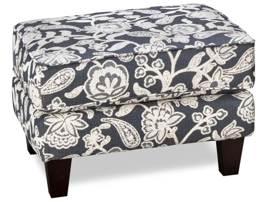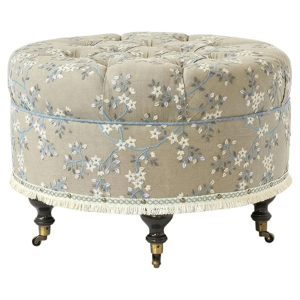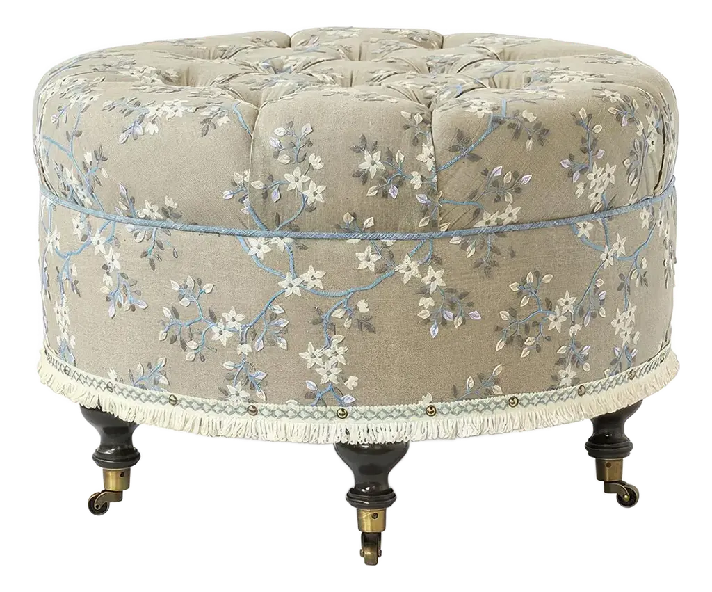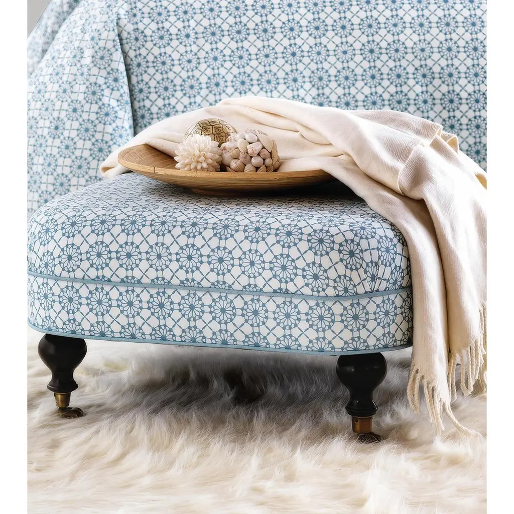 Bench-made in the USA by master upholsterers, this ottoman is thickly padded and tightly upholstered in geometric pattern fabric, featuring a delicate small welt finish for added elegance. The high-density foam ensures long-lasting durability and supreme comfort, making it perfect as a footrest, additional seating, or a decorative accent.Supported by solid wood legs in a rich Espresso finish, the ottoman is further enhanced by matte brass casters, allowing effortless movement while maintaining a sophisticated aesthetic. Whether placed in a traditional or contemporary setting, this ottoman brings versatility and style to your home.Dimensions: 26" W x 26" D x 15" HMade in the USA.Lead time is 6 weeks.Custom options are also available.