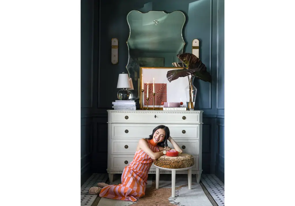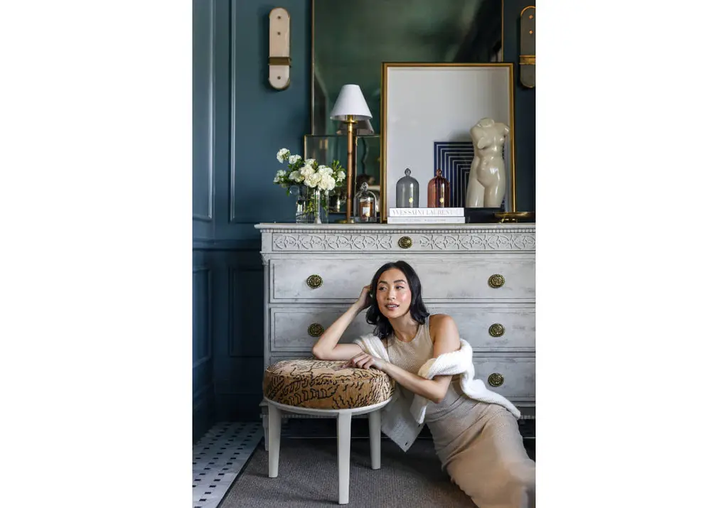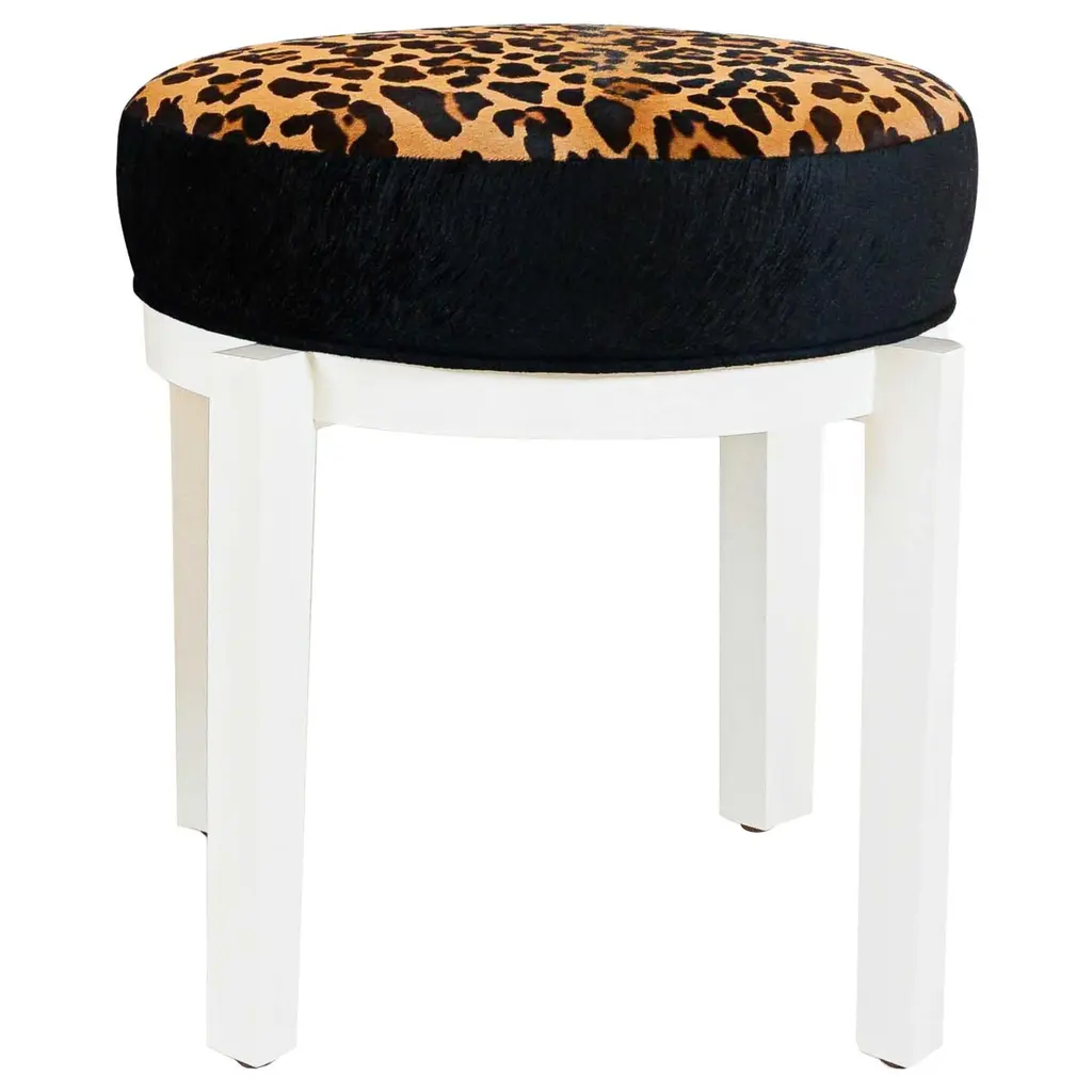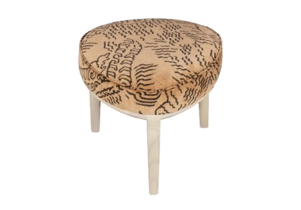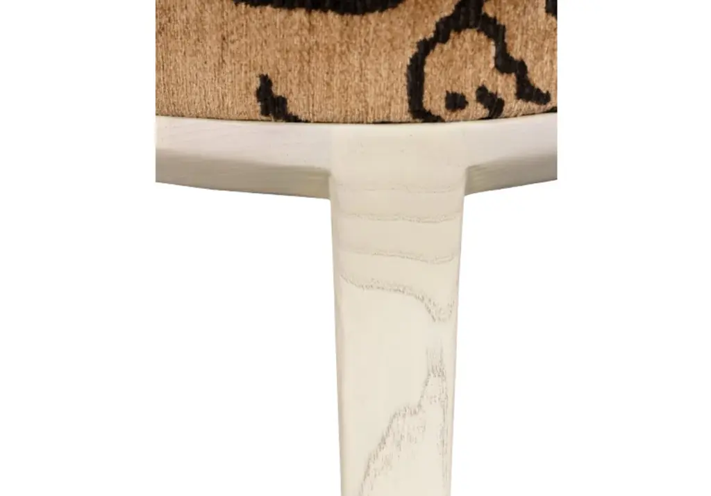 The Stevie Ottoman is that quiet kind of standout—sculptural, unexpected, and endlessly versatile. Shaped like a guitar pick with softened edges, it tucks beautifully under a center hall table, at the foot of a favorite chair, beneath your entry console, or even at the foot of a twin bed. Wrapped in a deconstructed tiger print and grounded on white, beveled legs—it's neutral, but never boring.