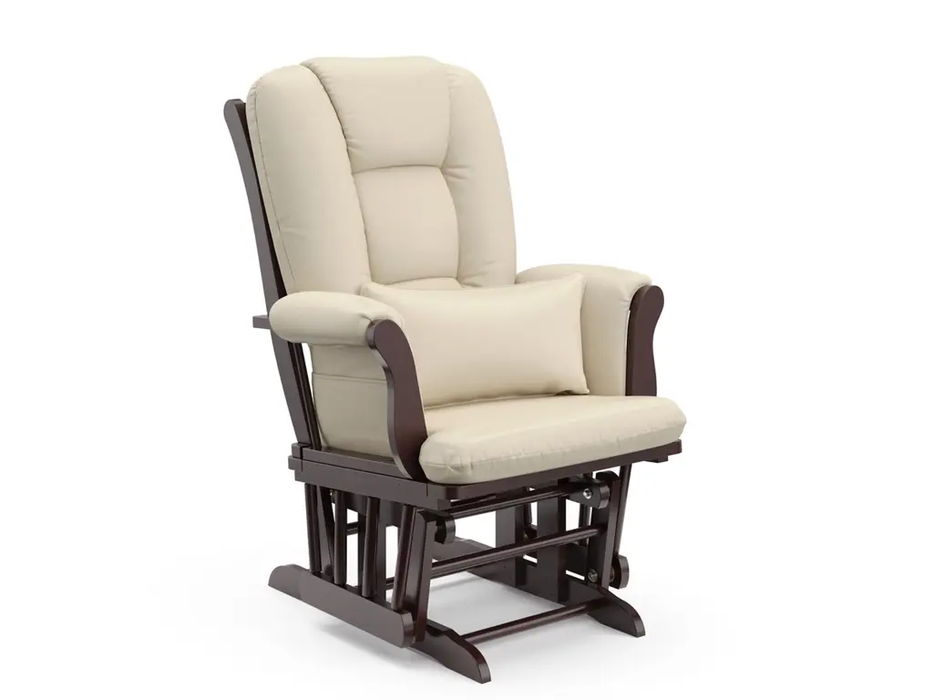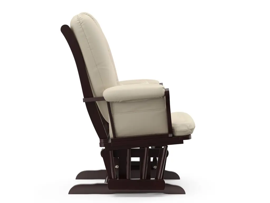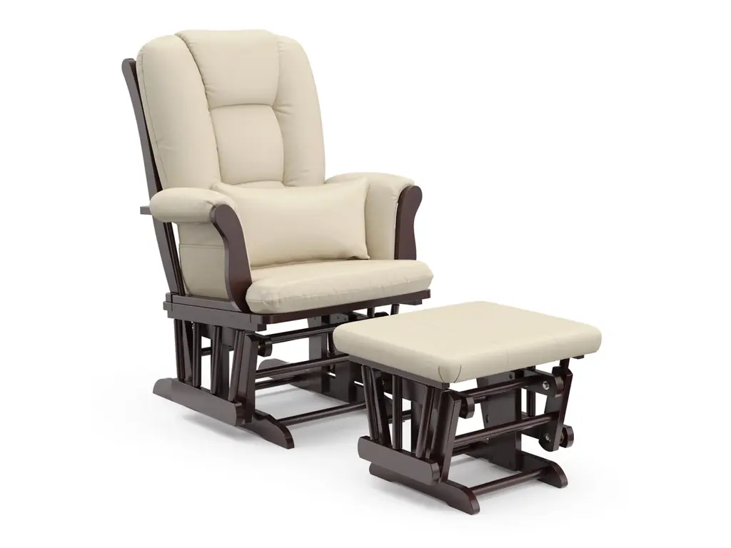 The Storkcraft Tuscany Glider & Ottoman brings comfort and style to snuggle time in the nursery. Enclosed metal ball bearings make for a smooth rocking motion, while its solid wood base provides you with quality you can depend on. Also, the its comfortable padded arm cushions are equipped with a convenient storage pocket, allowing you to keep your favorite reading materials (or small nursery essentials) within arm's reach. Nestle into the Storkcraft Tuscany Glider & Ottoman's cushions and kick your feet up on the padded ottoman. Exclusively from Storkcraft, proud recipient of the 2023 Women's Choice Award for 9 out of 10 Customer Recommended Baby & kids furniture.