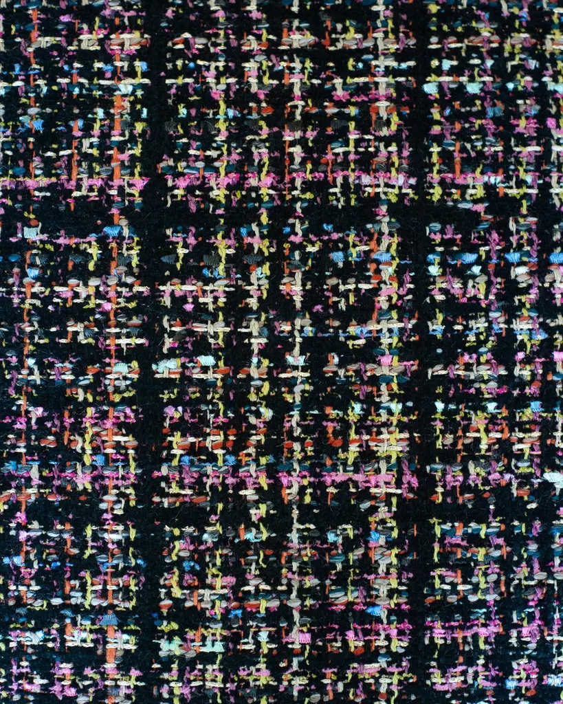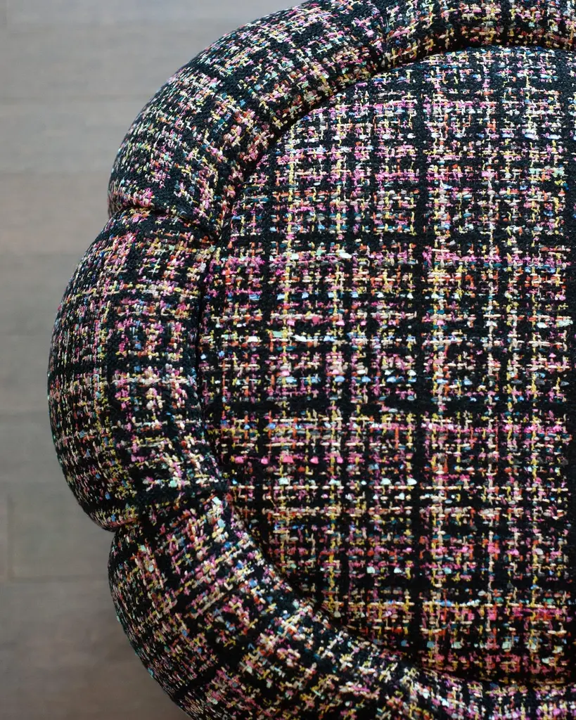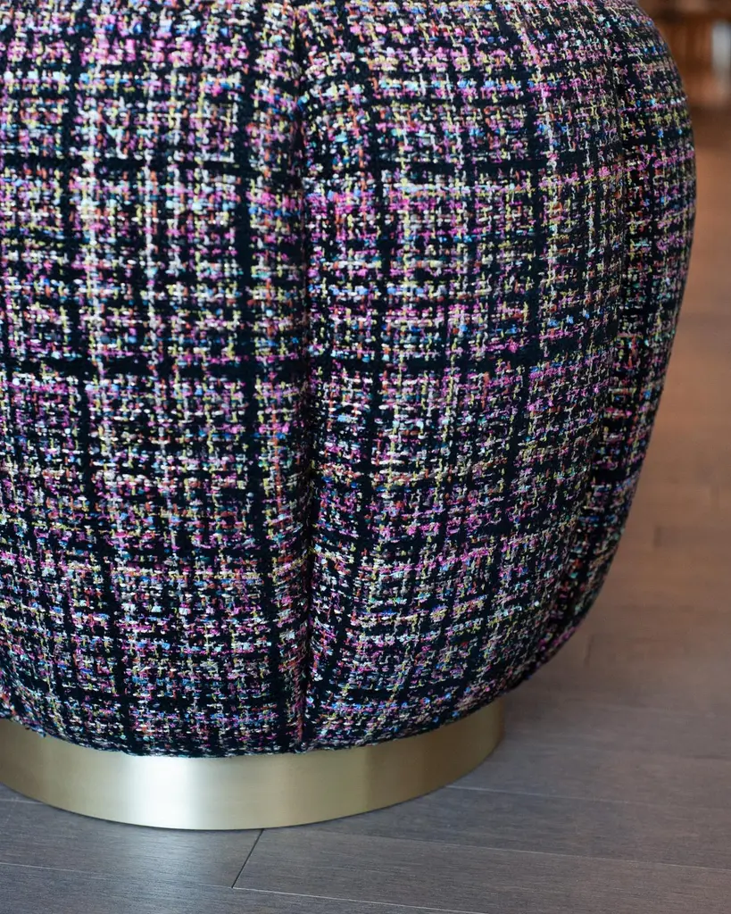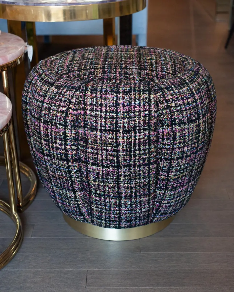 Elevate your space with the artistry of fine upholstery. This stunning hand-upholstered ottoman by Maison Nurita features a sculptural melon silhouette with elegant channelled sides, wrapped in luxurious black multicolour tweed and finished with a brushed golden metal base. A statement piece of timeless sophistication.