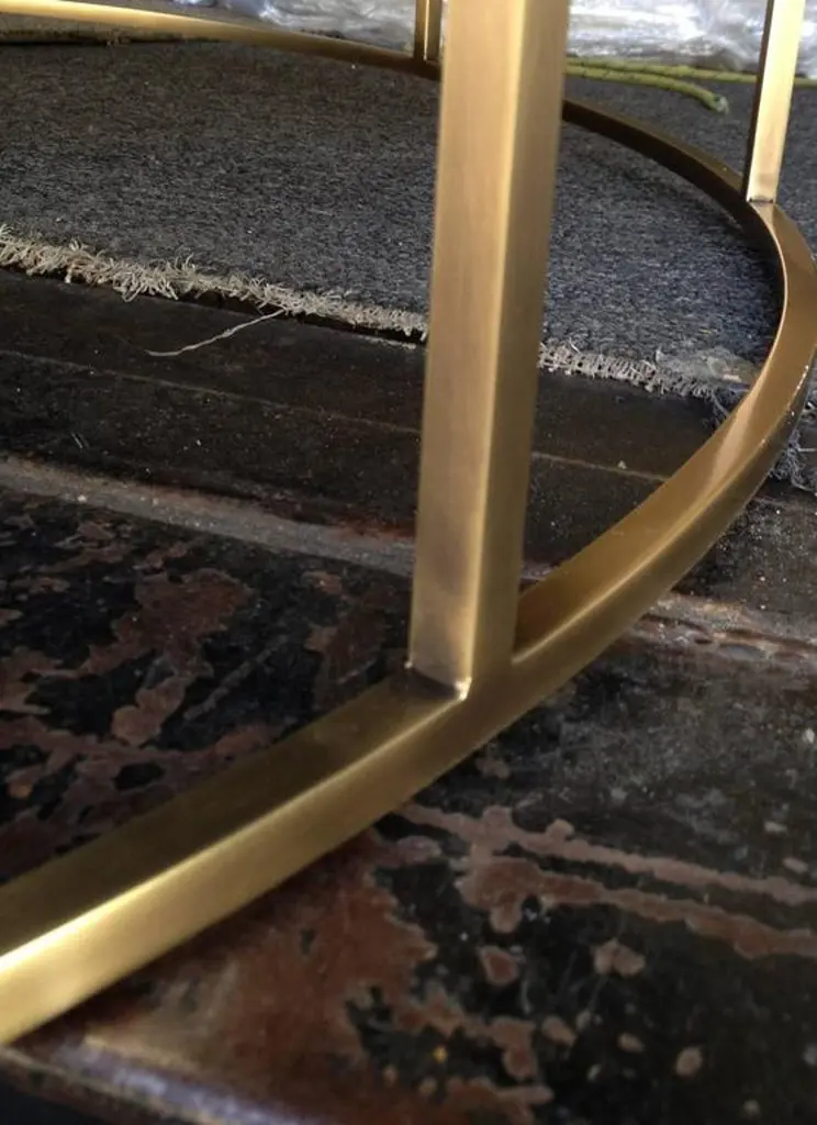 Beautiful round loveseat with upholstered top.This beautiful loveseat can be used indoors or outdoors, it is perfect for homes with large living or family rooms, ideal for entertaining.The base is beautifully crafted in solid brass finished in either antique, sating or polished finish, the top can be upholstered in your choice of fabric and the base can be made in brass (shown in antique brass) chrome, nickel (the one shown was custom-made for a client and upholstered in a chocolate brown velvet fabric).Measurements:45" diameter x 16 1/2" high