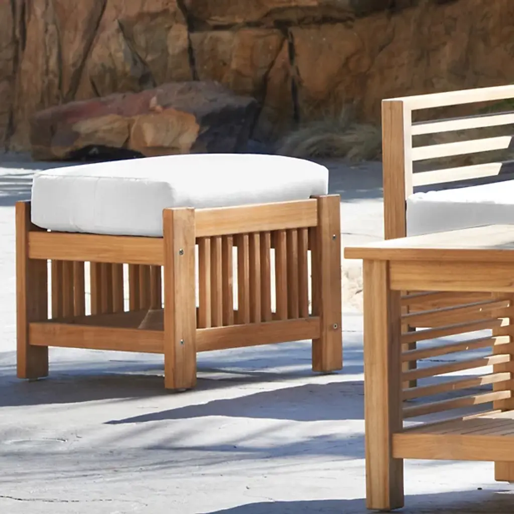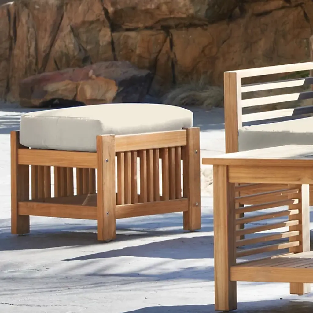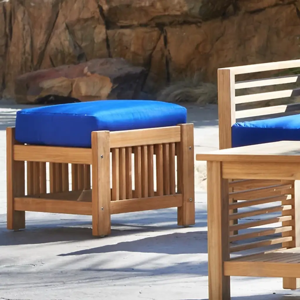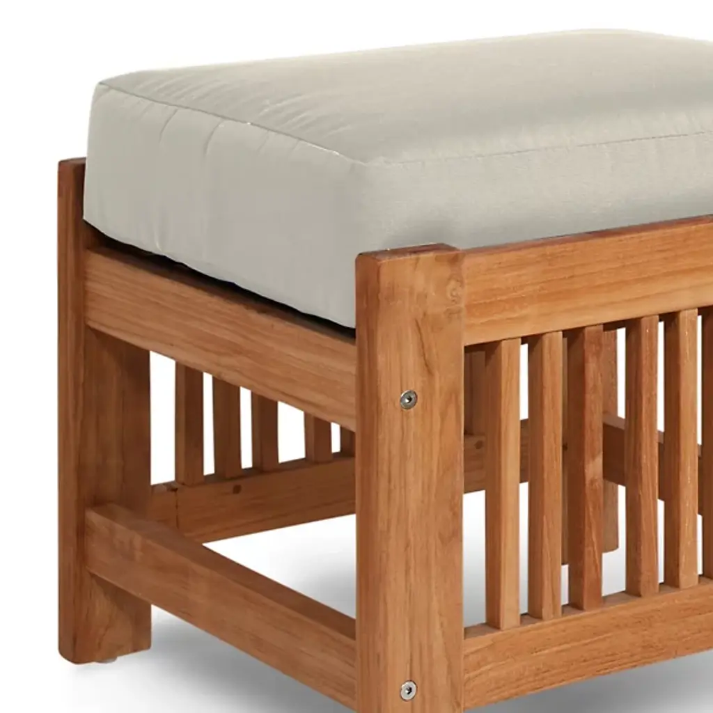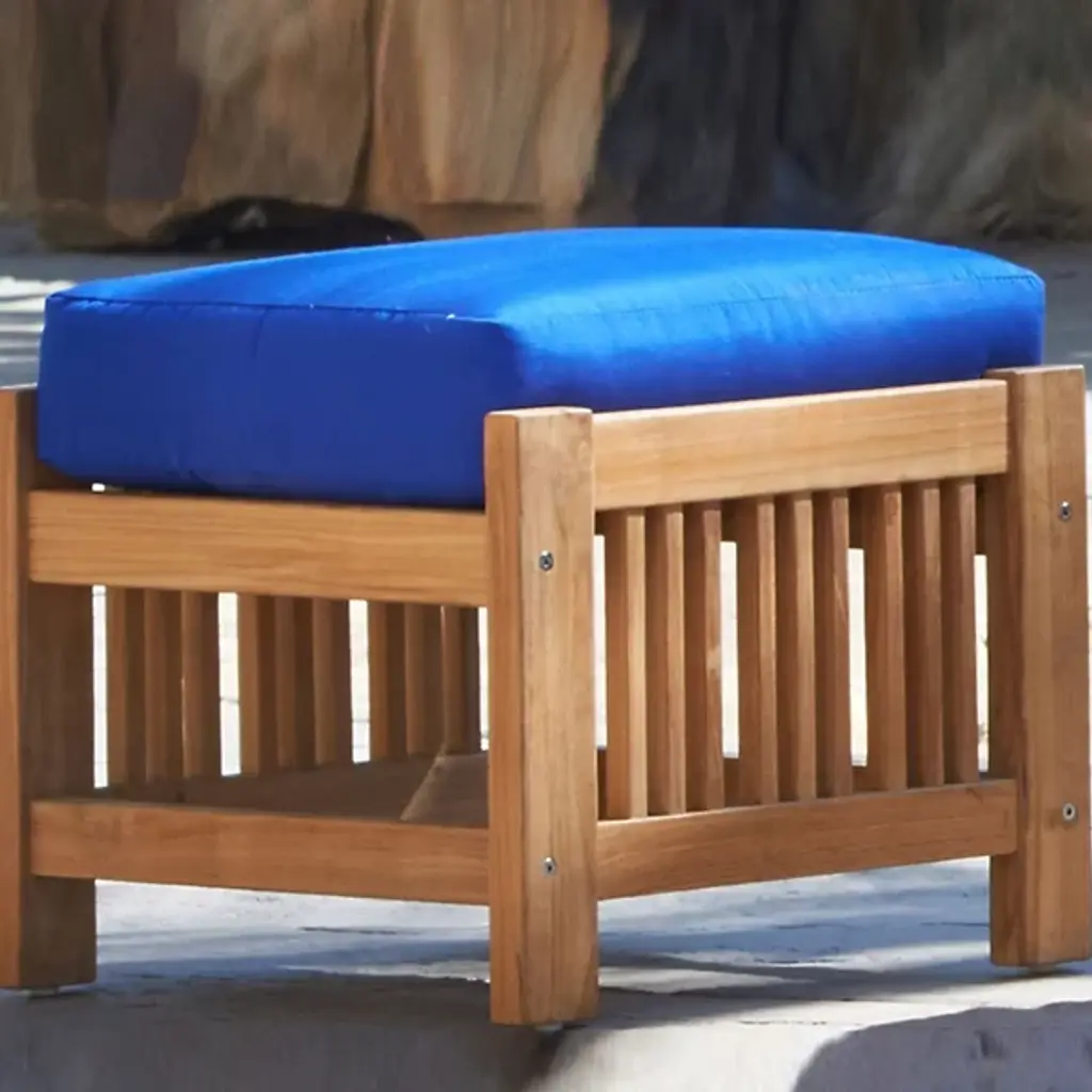 Sit back and enjoy the outdoors with help from the Summer Outdoor Ottoman from HiTeak Furniture. Complete the look of a poolside lounge area or patio with a warm and approachable design featuring a barred frame made of natural teak wood. A square cushion upholstered in sunbrella fabric offers a comfortable resting space that can be easily moved around the area to suit the space while its durable composition ensures quality that will last for years to come.