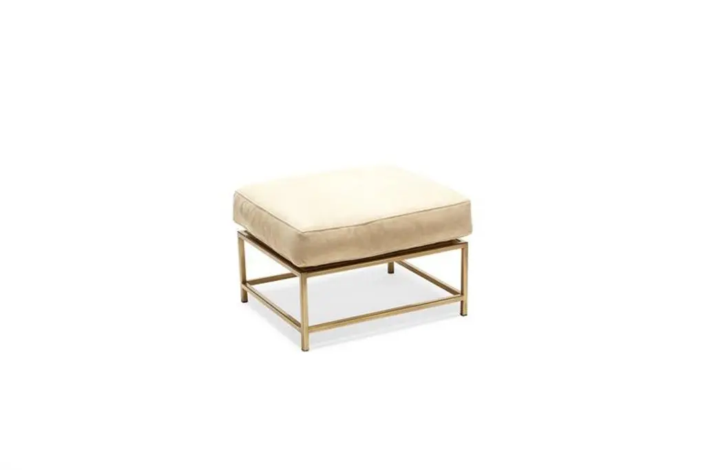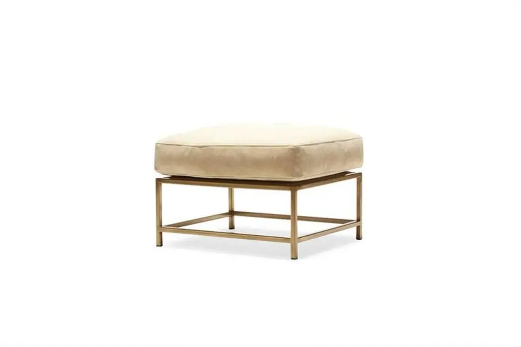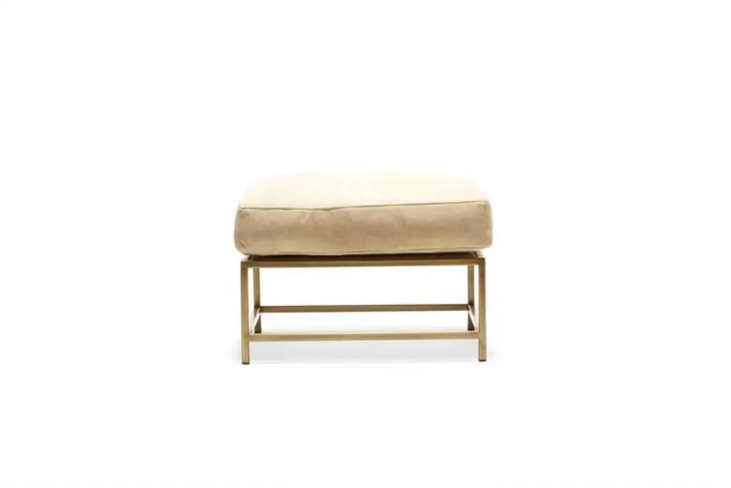 The Ottoman from Stephen Kenn's Inheritance Collection is an easily customizable design that can be used to add a lounge element to any seating arrangement, and pairs especially well with the other seating options in the Inheritance Collection.This variation is upholstered in a sandy shade of nubuck from the Burnham Collection by Moore & Giles. Sitting atop an antique brass frame, the cushion is wrapped in down, allowing for a soft and comfortable lounge experience.Every Stephen Kenn piece is made to order through our Los Angeles studio. We create these pieces utilizing a number of small businesses and fabricators in the LA area. We welcome inquiries about custom dimensions or custom material combinations to best fit your space and personal aesthetic.