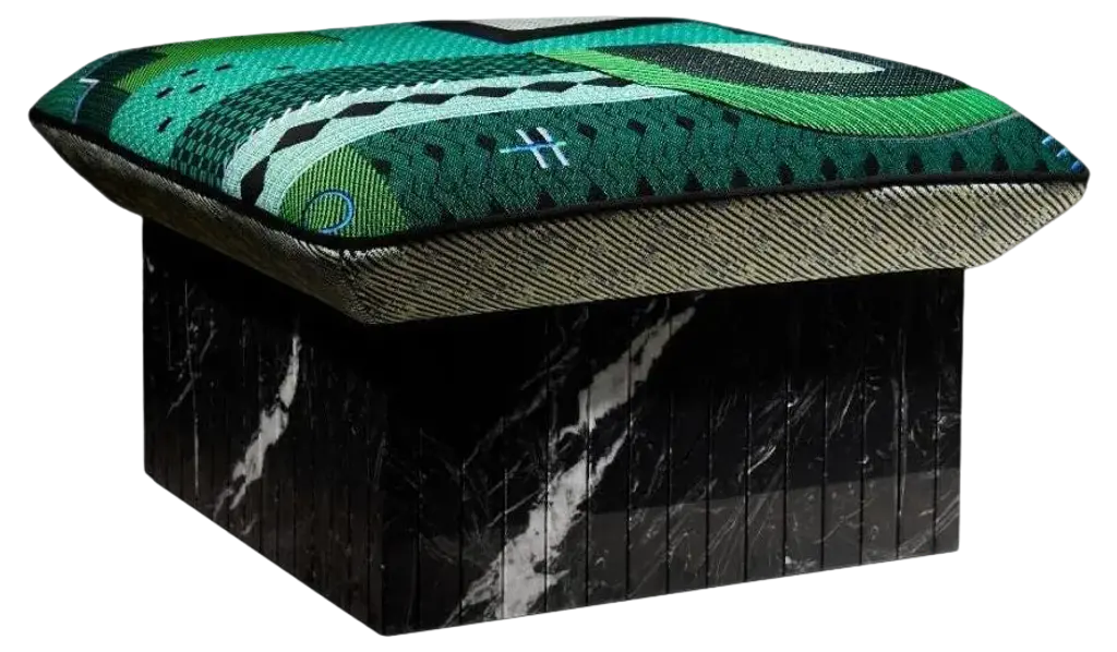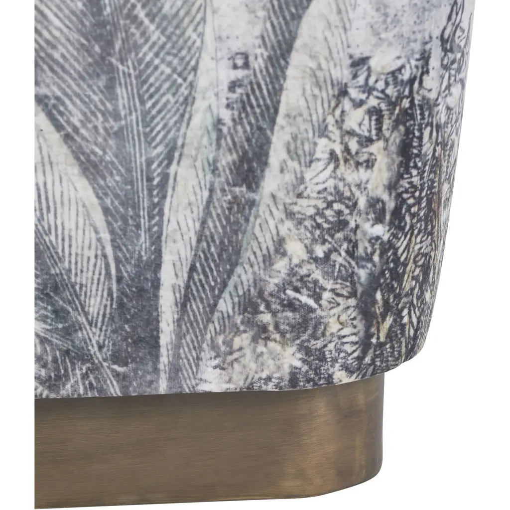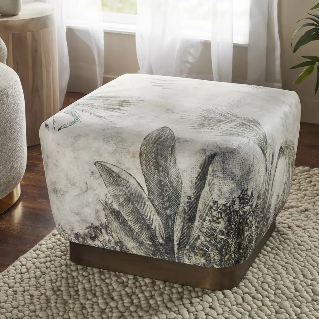 Artistry and charm envelop the living room space through this ottoman design. Capable of being used as a footrest, seat, or decorative detail, this piece of furniture is best paired with a solid-colored armchair that allows its print to pop. While the ottomans nature-inspired design holds an inherent soft quality, thanks to its velvet construction.