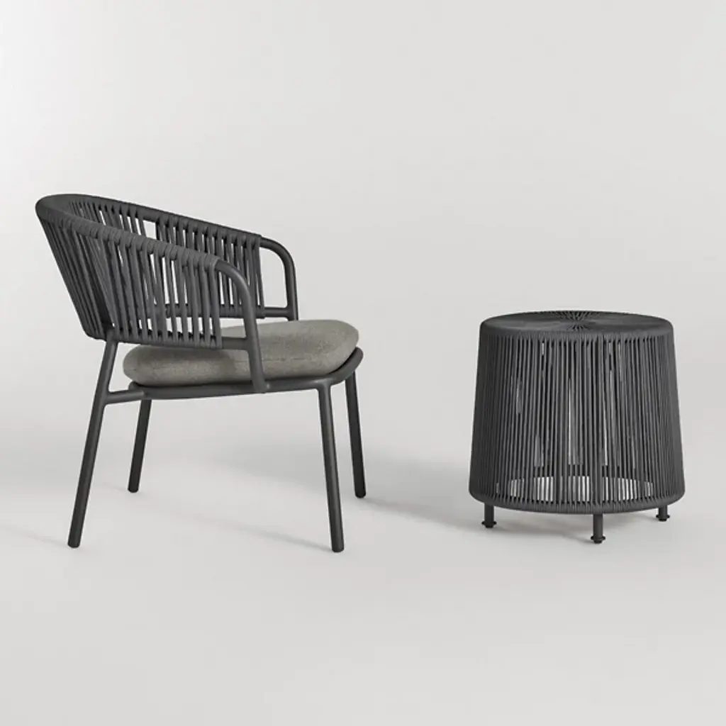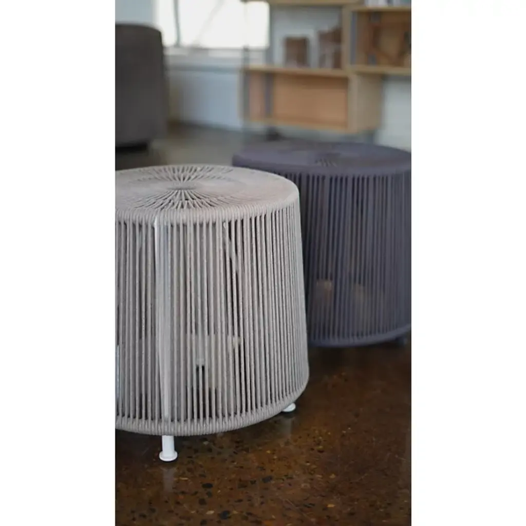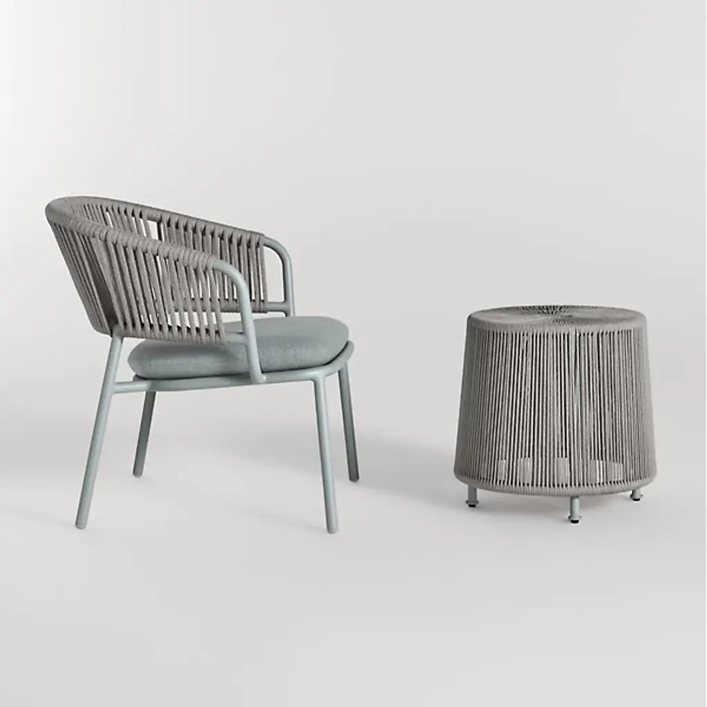 The Tether Outdoor Ottoman from Blu Dot showcases hundreds of individual rope strands that create continuous vertical texture around its perimeter. Each strand extends from top to bottom, forming a surface that invites touch while resisting weather damage. The lightweight aluminum frame provides corrosion resistance without adding unnecessary weight. This ottoman functions as extra seating for gatherings or as a footrest for lounging and ships fully assembled for immediate placement on patios, decks, or poolside areas.