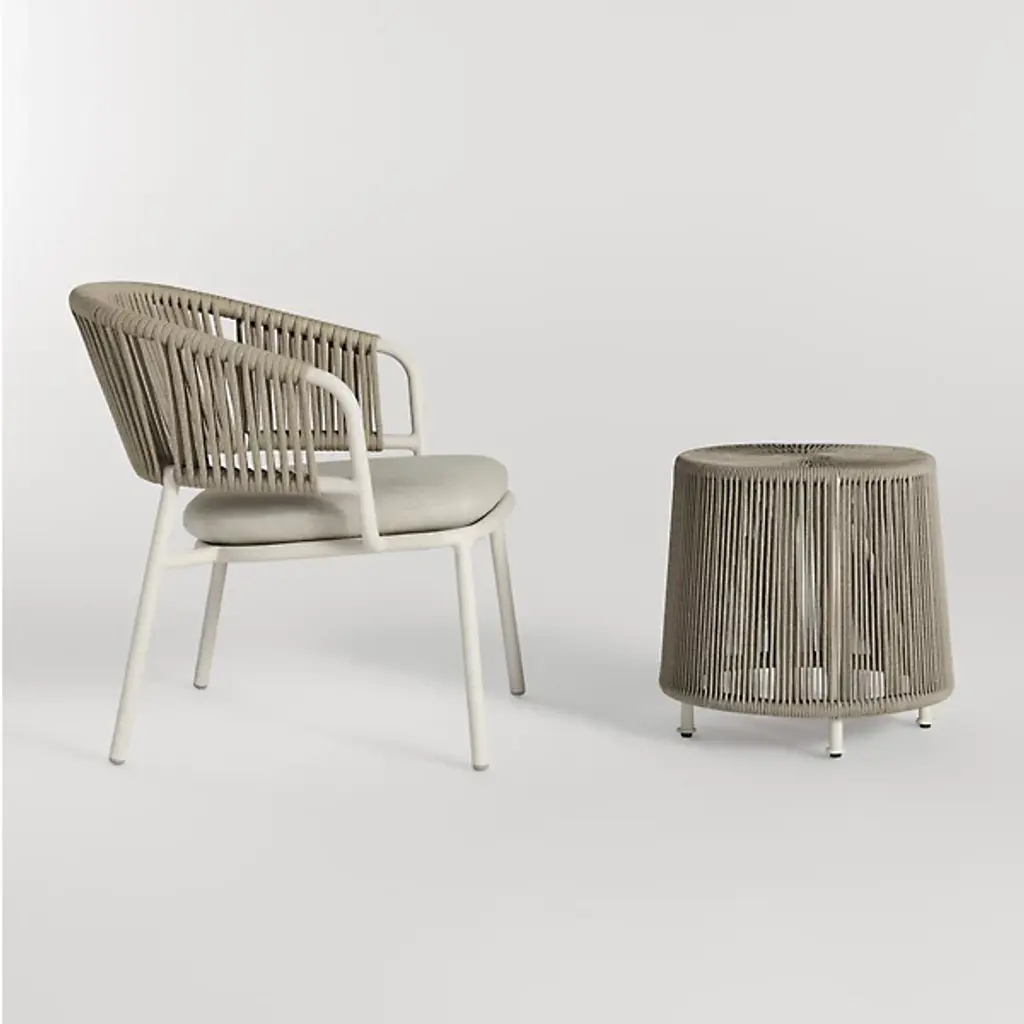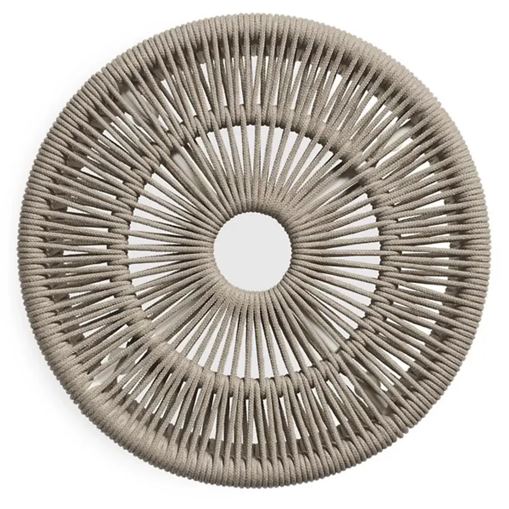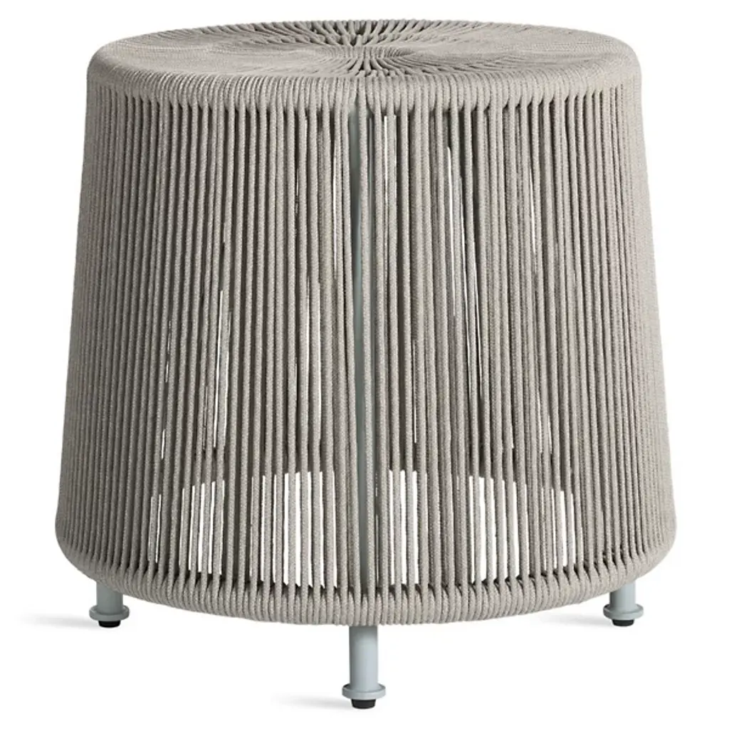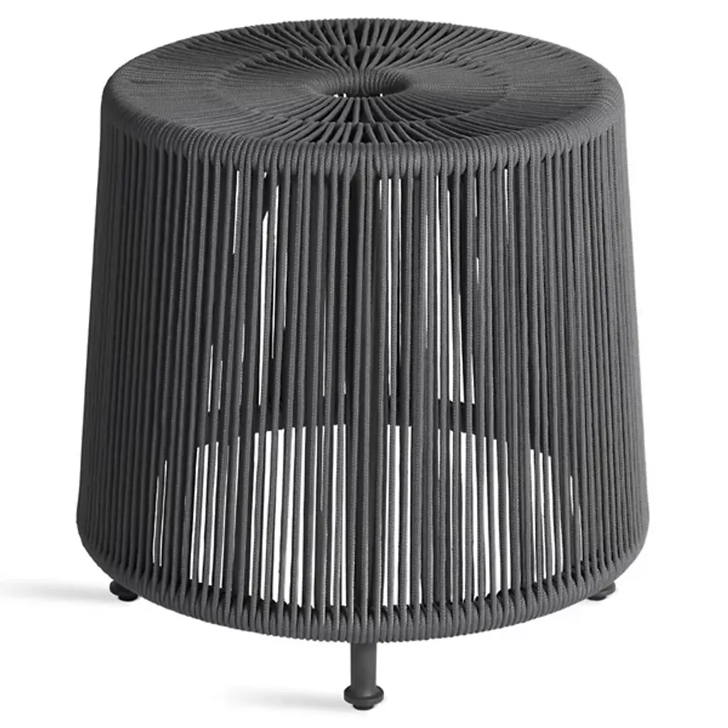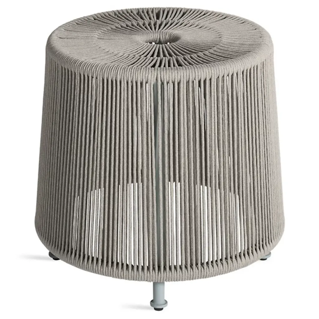 The Tether Outdoor Ottoman from Blu Dot showcases hundreds of individual rope strands that create continuous vertical texture around its perimeter. Each strand extends from top to bottom, forming a surface that invites touch while resisting weather damage. The lightweight aluminum frame provides corrosion resistance without adding unnecessary weight. This ottoman functions as extra seating for gatherings or as a footrest for lounging and ships fully assembled for immediate placement on patios, decks, or poolside areas.