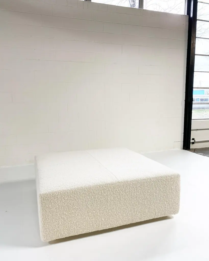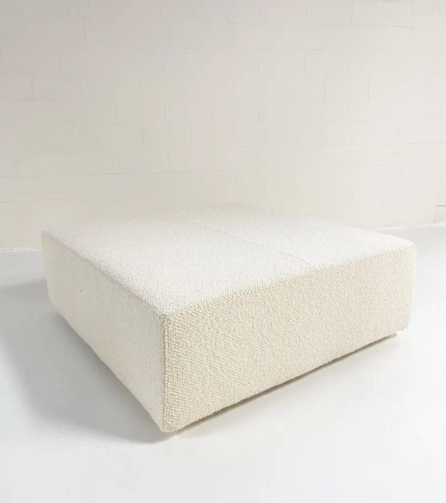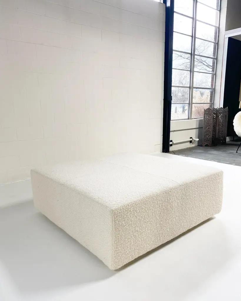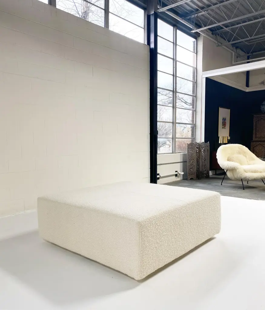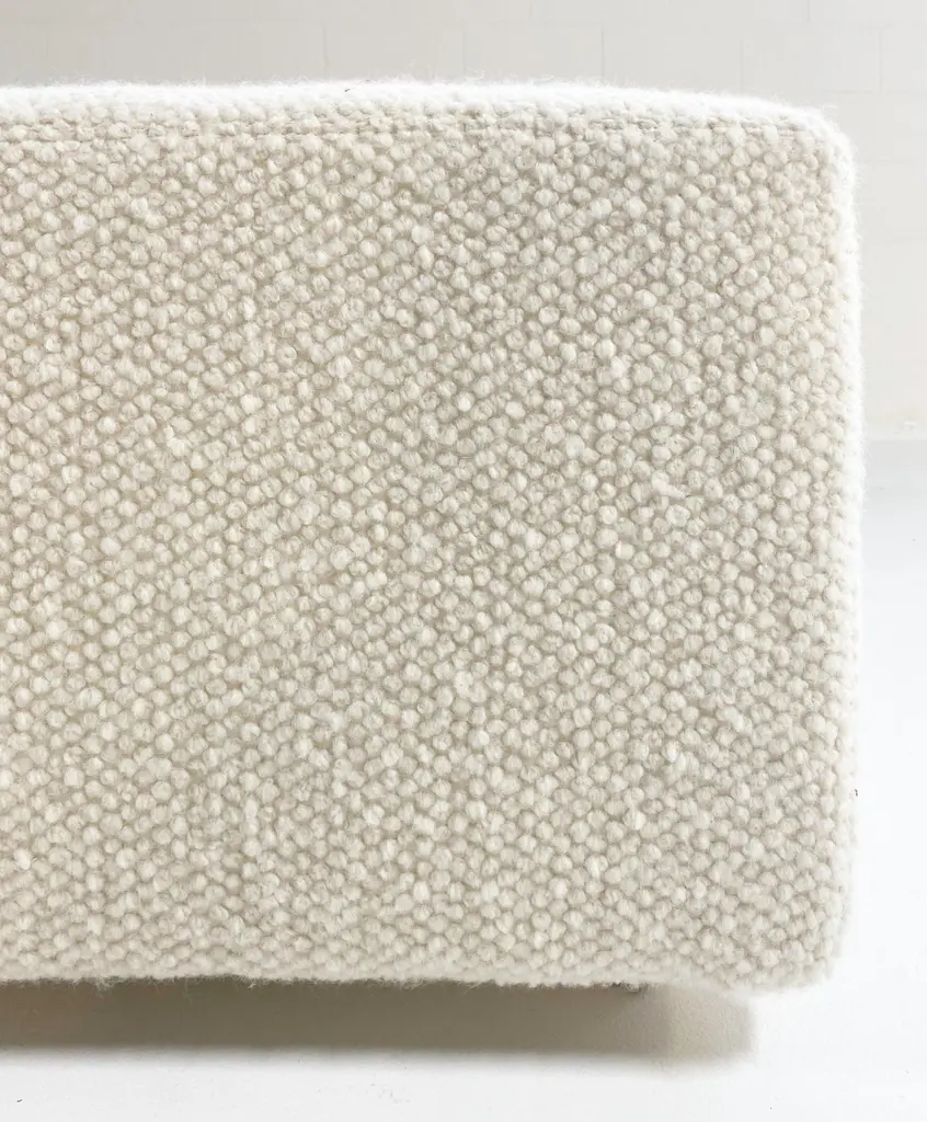 This Forsyth Ottoman is designed and handcrafted from Dedar's beautiful boucle wool in cream. This is a versatile piece for any room adding natural texture and pattern. The perfect coffee table, ottoman, or extra seating. Each ottoman is completely handmade by our amazing team of master upholsterers. Custom made to order. Please allow 10 to 12 weeks. Custom sizes available. The ottoman can be made completely bespoke to meet your design needs. Measures: 54 x 54 in.