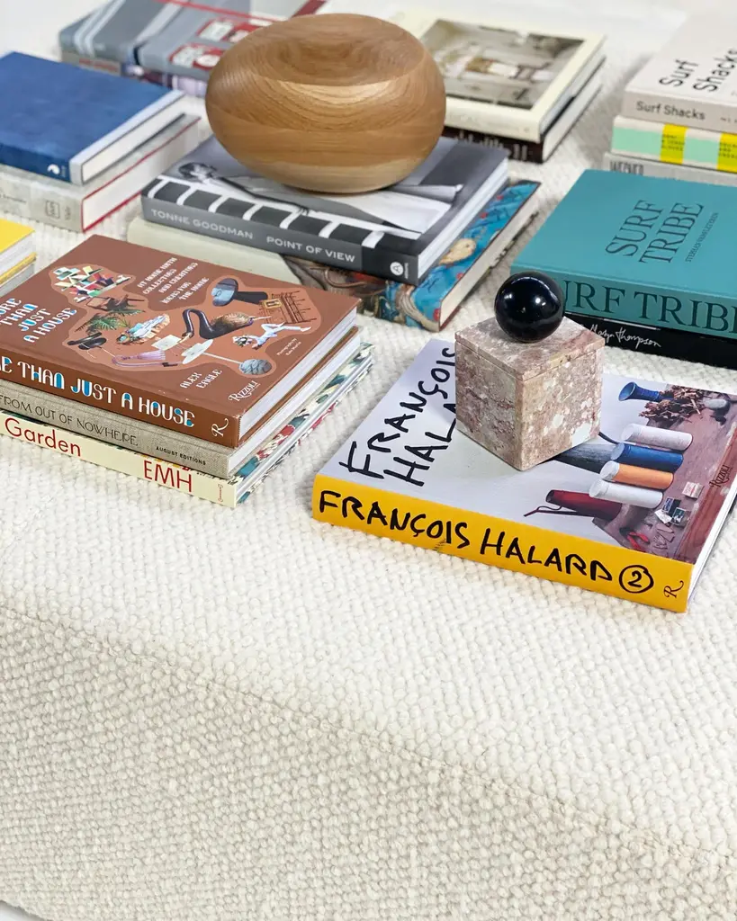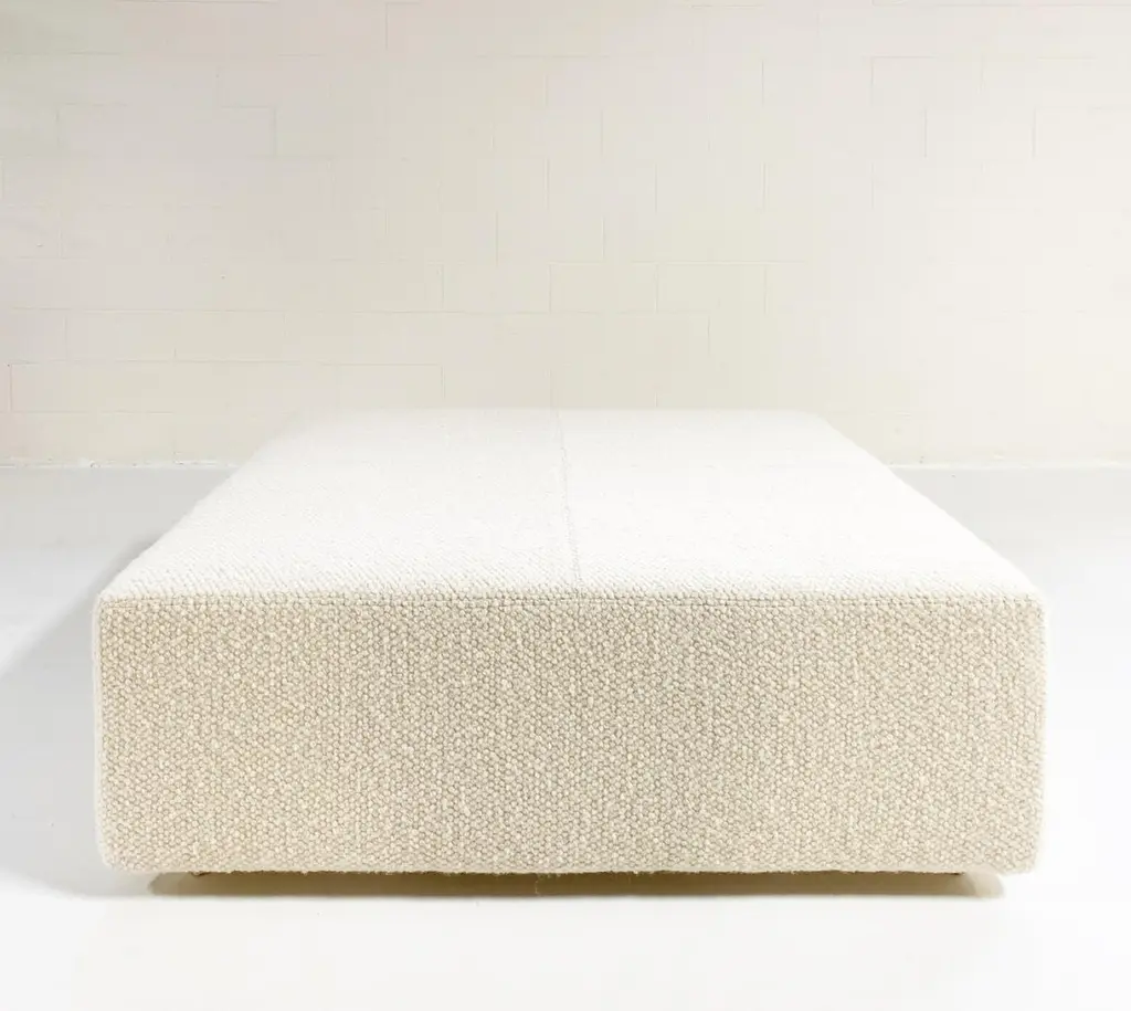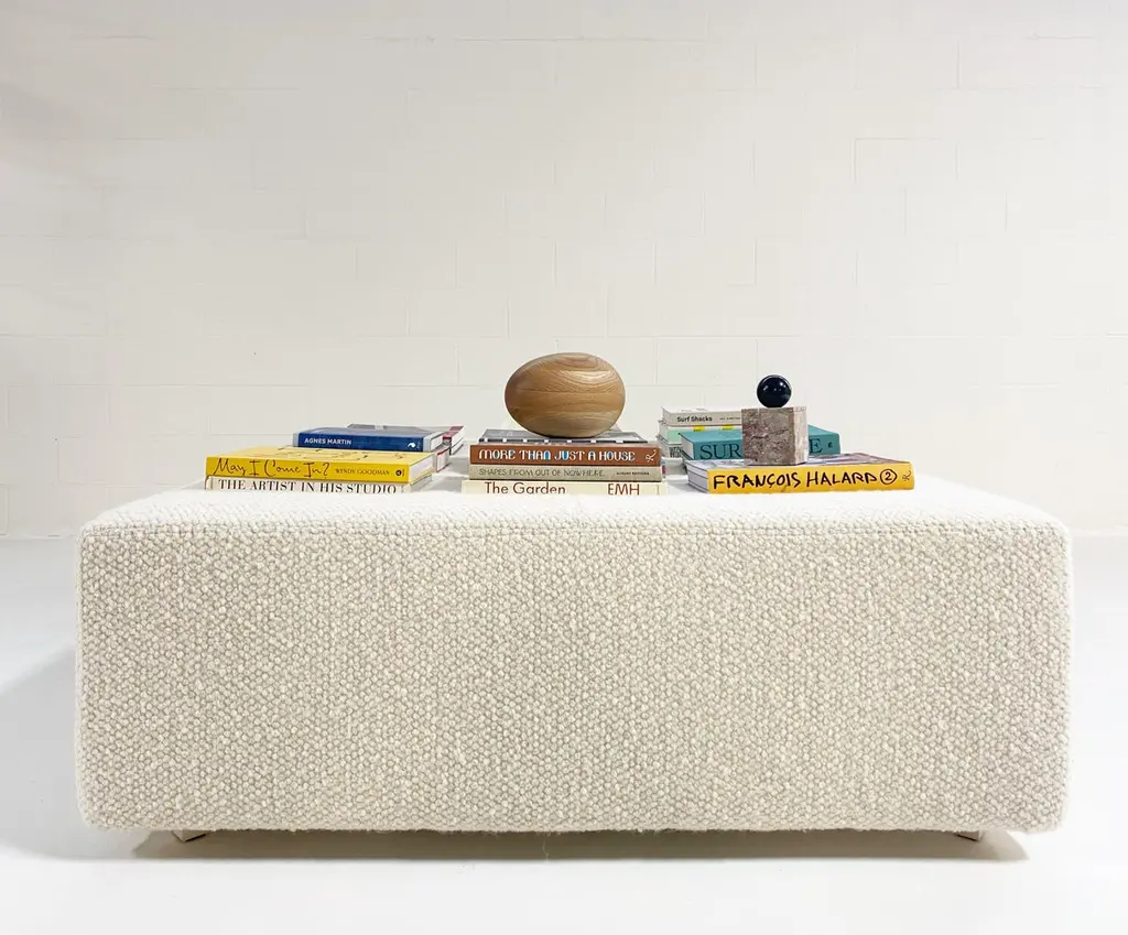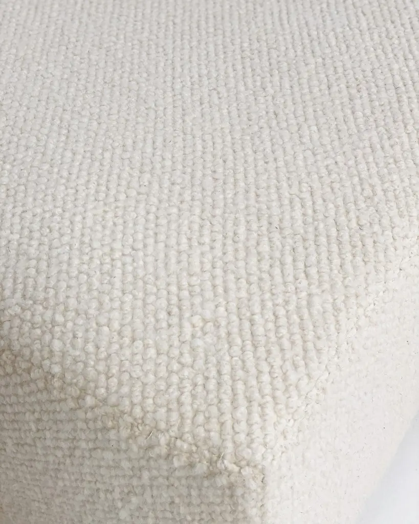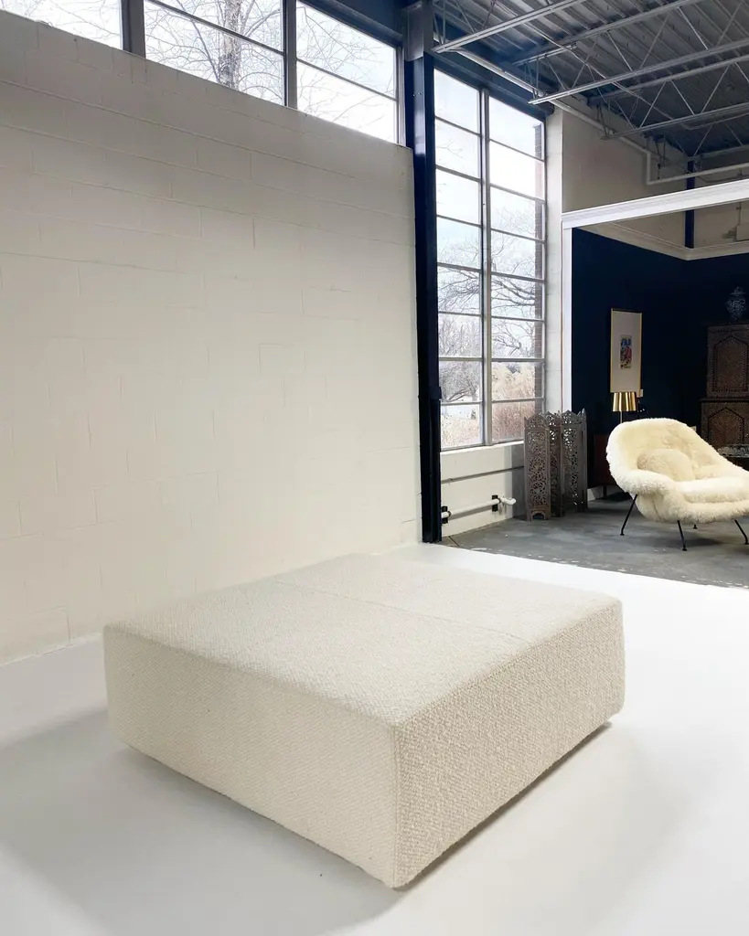 This Forsyth Ottoman is designed and handcrafted from Dedar's beautiful boucle wool in cream. This is a versatile piece for any room adding natural texture and pattern. The perfect coffee table, ottoman, or extra seating. Each ottoman is completely handmade by our amazing team of master upholsterers. Custom made to order. Please allow 10 to 12 weeks. Custom sizes available. The ottoman can be made completely bespoke to meet your design needs. Measures: 54 x 54 in.