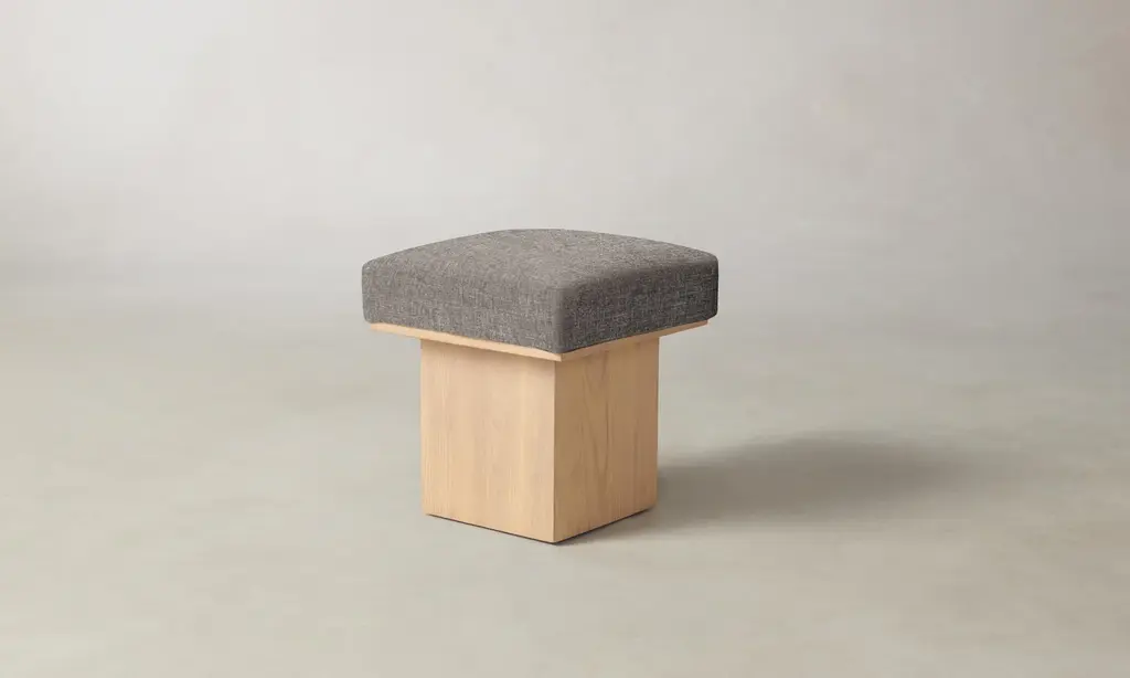 The Mulberry Ottoman's geometric silhouette exudes sophistication. It has a masterfully upholstered seat cushion that sits atop a striking ash pedestal base. Handcrafted in North Carolina.