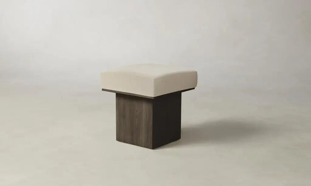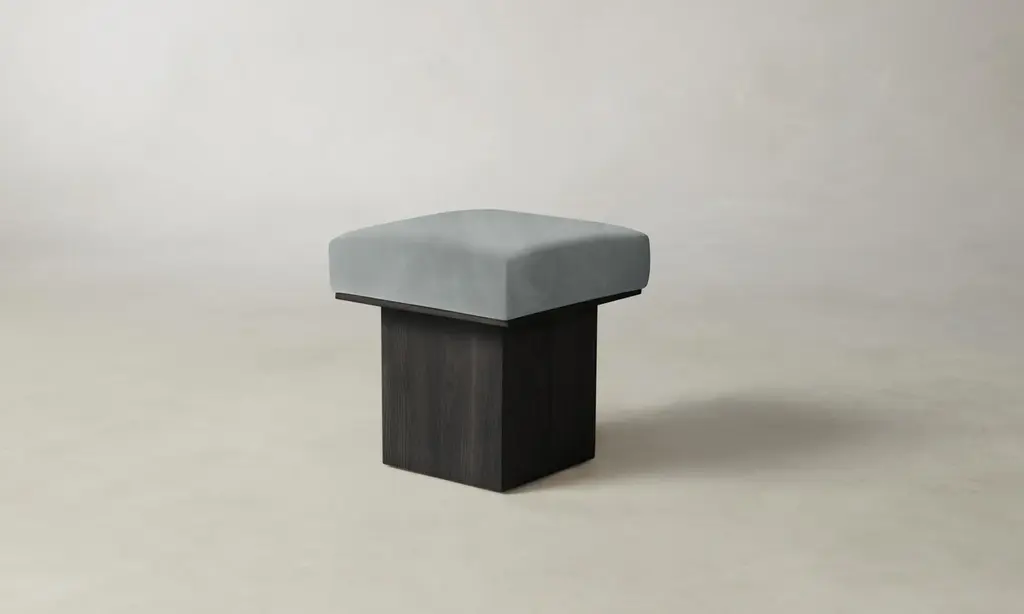 The Mulberry Ottoman's geometric silhouette exudes sophistication. It has a masterfully upholstered seat cushion that sits atop a striking ash pedestal base. Handcrafted in North Carolina.