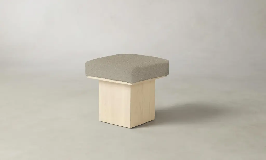 The Mulberry Ottoman's geometric silhouette exudes sophistication. It has a masterfully upholstered seat cushion that sits atop a striking ash pedestal base. Handcrafted in North Carolina.