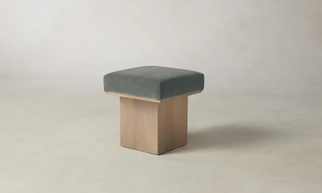 The Mulberry Ottoman's geometric silhouette exudes sophistication. It has a masterfully upholstered seat cushion that sits atop a striking ash pedestal base. Handcrafted in North Carolina.