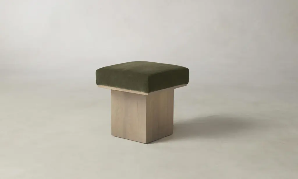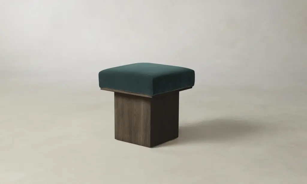 The Mulberry Ottoman's geometric silhouette exudes sophistication. It has a masterfully upholstered seat cushion that sits atop a striking ash pedestal base. Handcrafted in North Carolina.