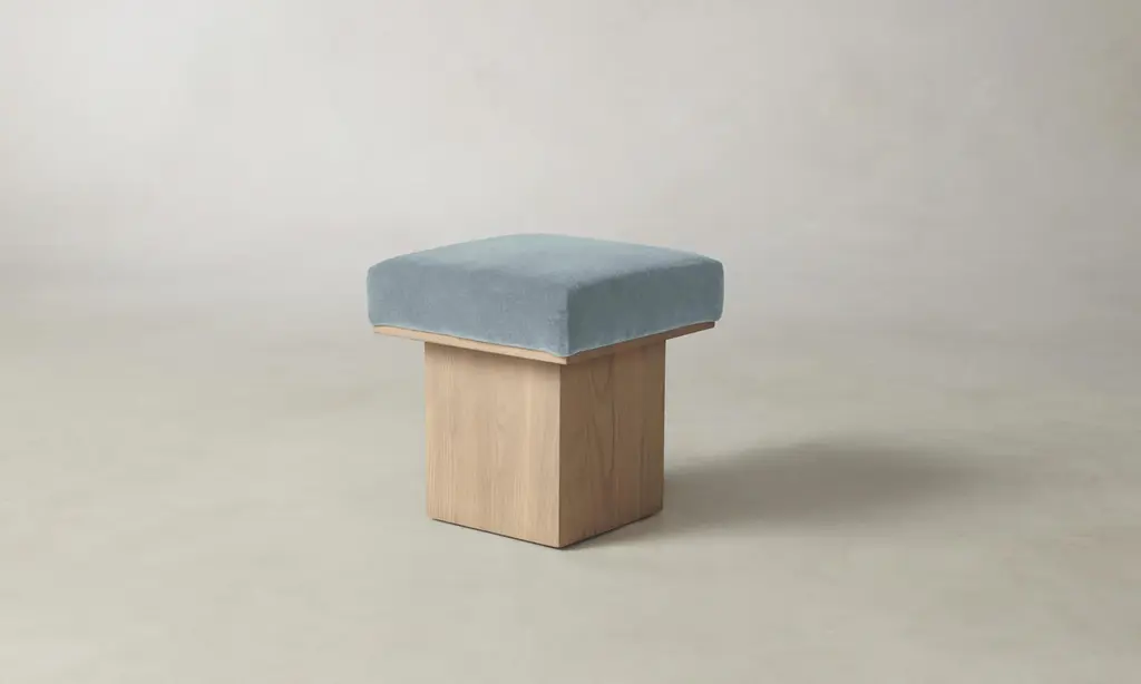 The Mulberry Ottoman's geometric silhouette exudes sophistication. It has a masterfully upholstered seat cushion that sits atop a striking ash pedestal base. Handcrafted in North Carolina.