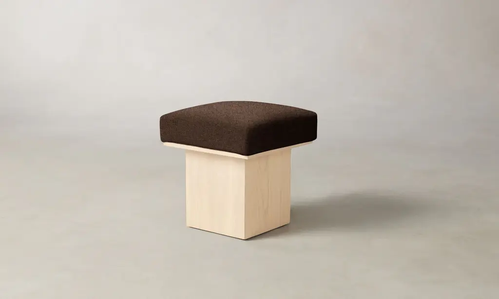 The Mulberry Ottoman's geometric silhouette exudes sophistication. It has a masterfully upholstered seat cushion that sits atop a striking ash pedestal base. Handcrafted in North Carolina.
