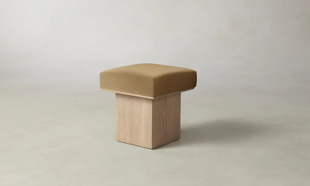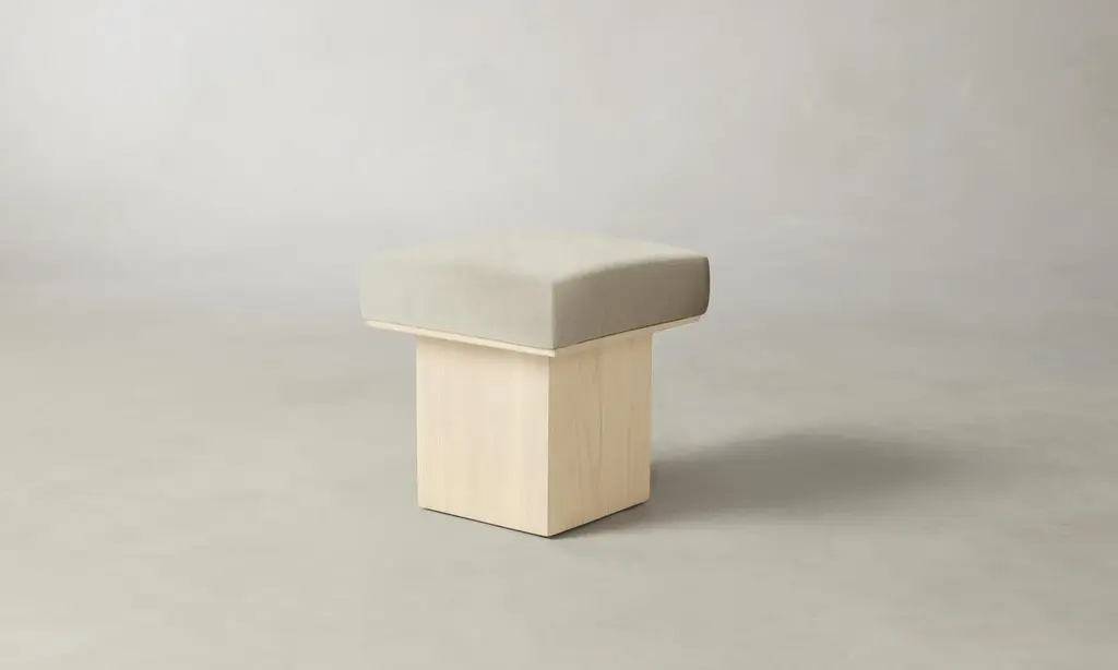 The Mulberry Ottoman's geometric silhouette exudes sophistication. It has a masterfully upholstered seat cushion that sits atop a striking ash pedestal base. Handcrafted in North Carolina.
