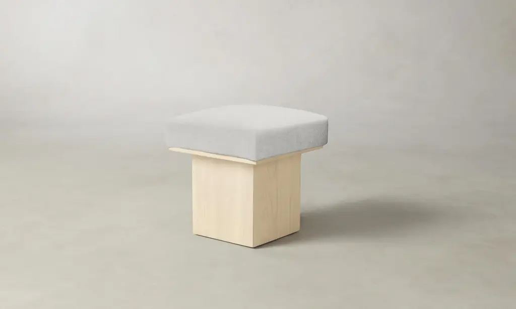 The Mulberry Ottoman's geometric silhouette exudes sophistication. It has a masterfully upholstered seat cushion that sits atop a striking ash pedestal base. Handcrafted in North Carolina.