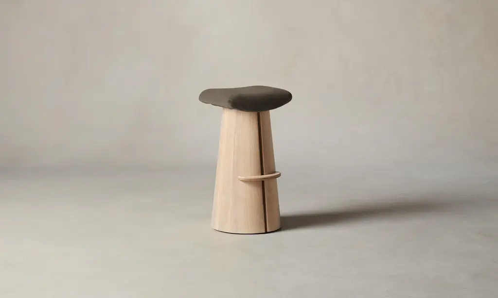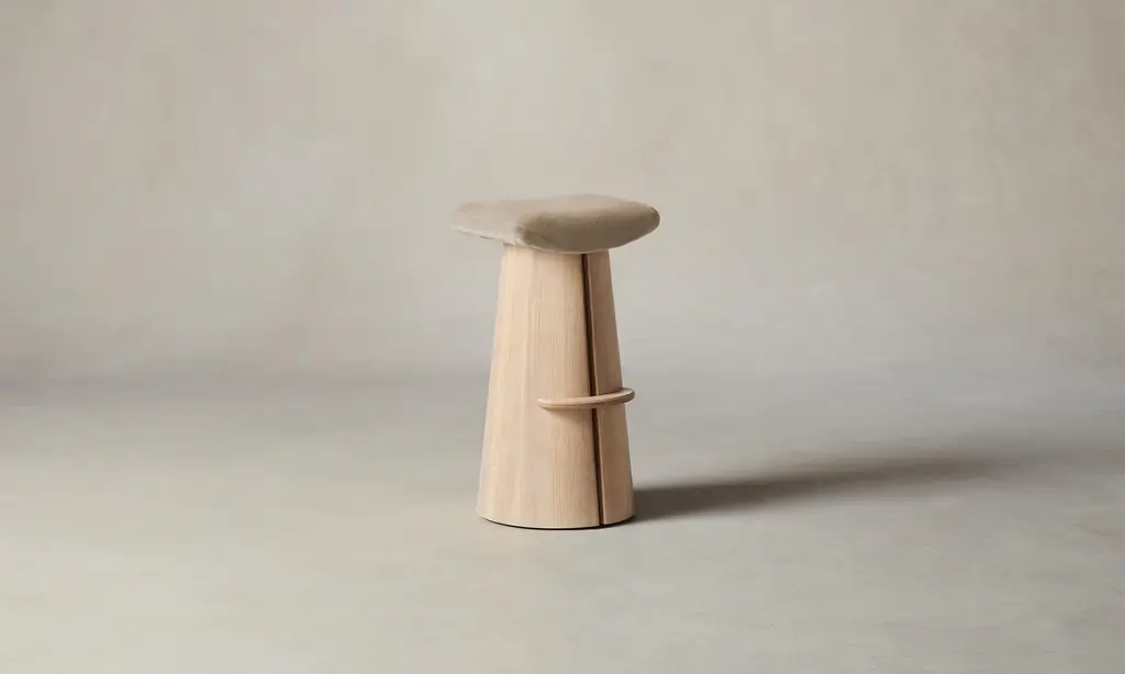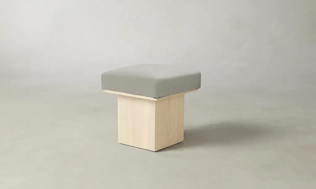 The Mulberry Ottoman's geometric silhouette exudes sophistication. It has a masterfully upholstered seat cushion that sits atop a striking ash pedestal base. Handcrafted in North Carolina.