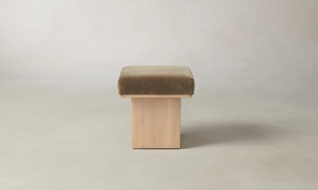 The Mulberry Ottoman's geometric silhouette exudes sophistication. It has a masterfully upholstered seat cushion that sits atop a striking ash pedestal base. Handcrafted in North Carolina.
