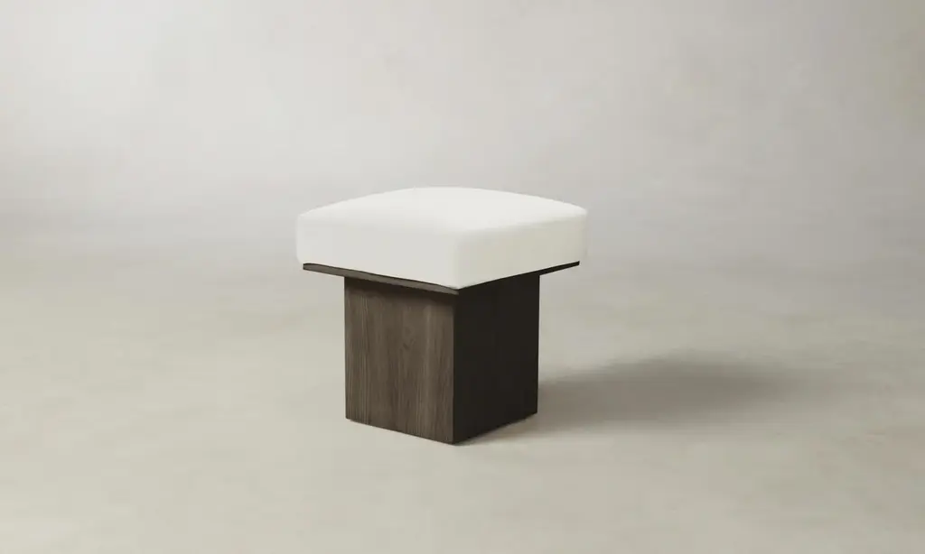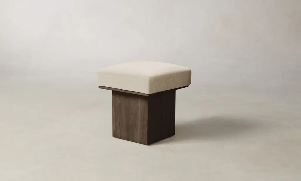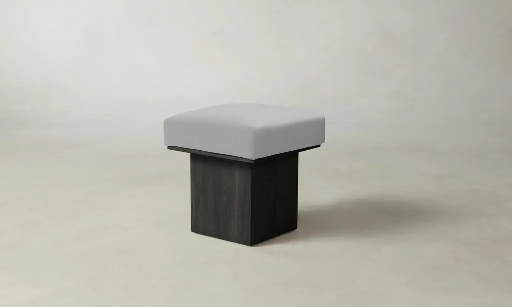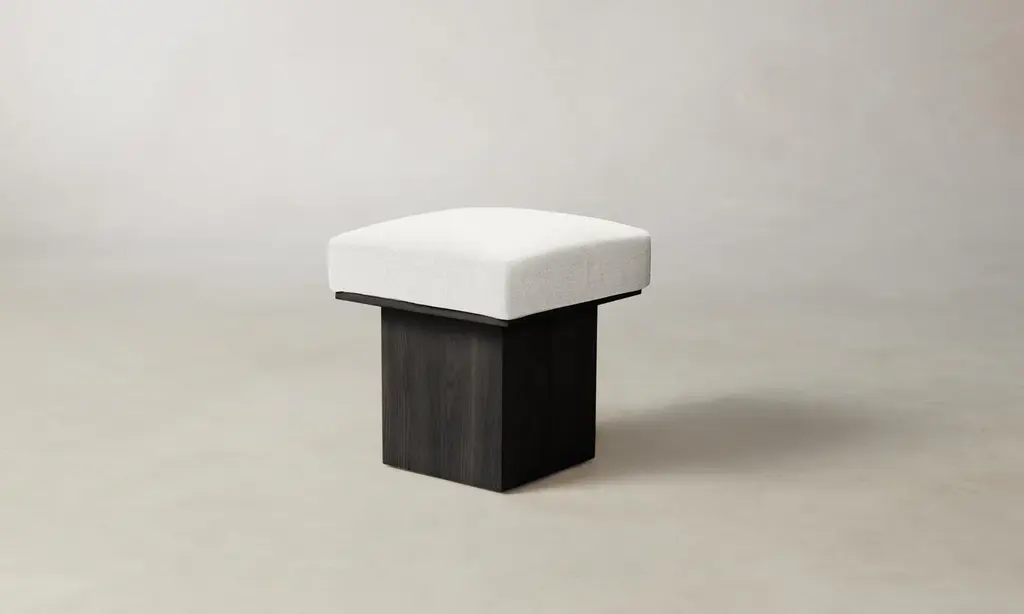 The Mulberry Ottoman's geometric silhouette exudes sophistication. It has a masterfully upholstered seat cushion that sits atop a striking ash pedestal base. Handcrafted in North Carolina.