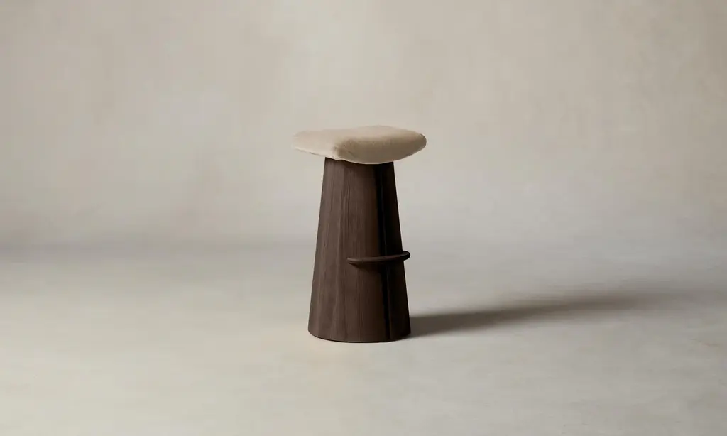 The Mulberry Ottoman's geometric silhouette exudes sophistication. It has a masterfully upholstered seat cushion that sits atop a striking ash pedestal base. Handcrafted in North Carolina.