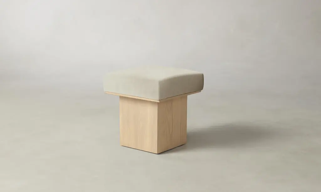 The Mulberry Ottoman's geometric silhouette exudes sophistication. It has a masterfully upholstered seat cushion that sits atop a striking ash pedestal base. Handcrafted in North Carolina.