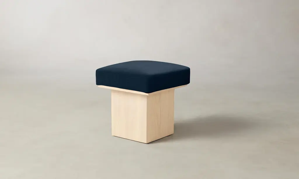 The Mulberry Ottoman's geometric silhouette exudes sophistication. It has a masterfully upholstered seat cushion that sits atop a striking ash pedestal base. Handcrafted in North Carolina.