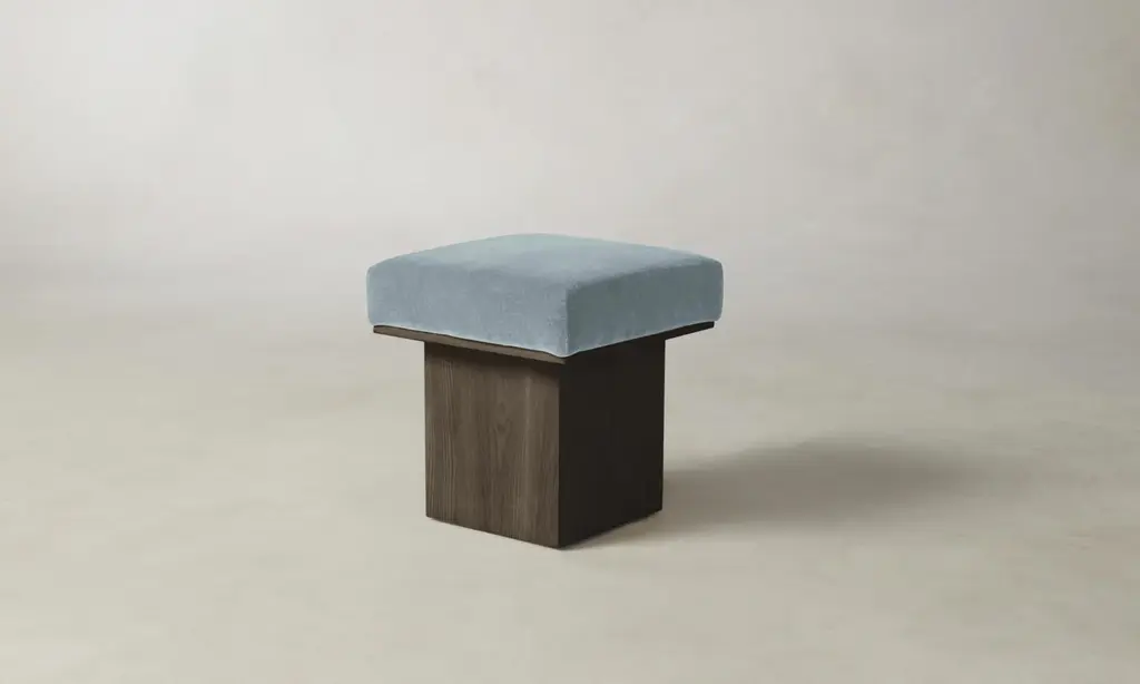 The Mulberry Ottoman's geometric silhouette exudes sophistication. It has a masterfully upholstered seat cushion that sits atop a striking ash pedestal base. Handcrafted in North Carolina.