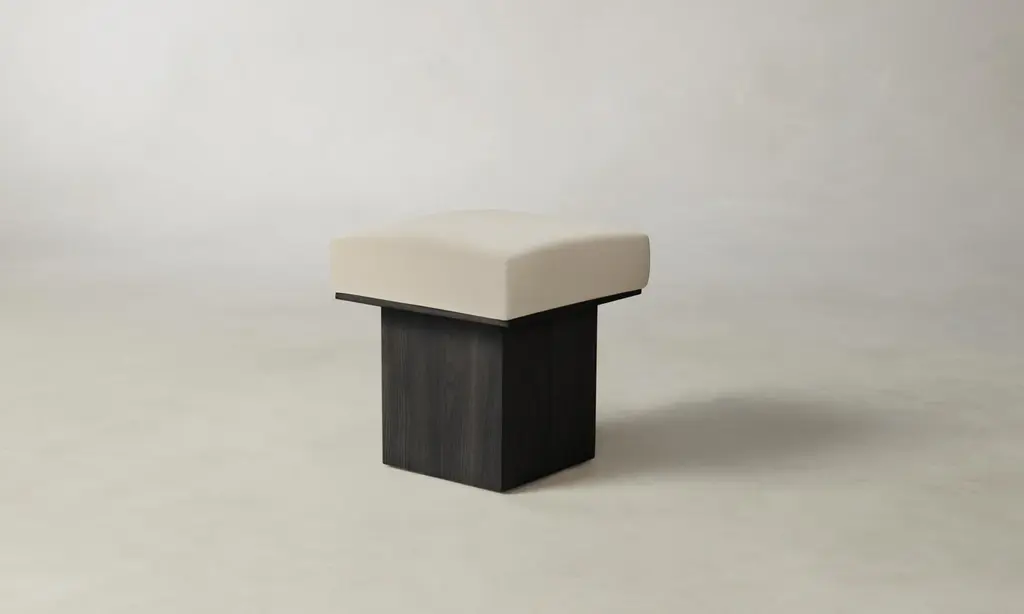 The Mulberry Ottoman's geometric silhouette exudes sophistication. It has a masterfully upholstered seat cushion that sits atop a striking ash pedestal base. Handcrafted in North Carolina.