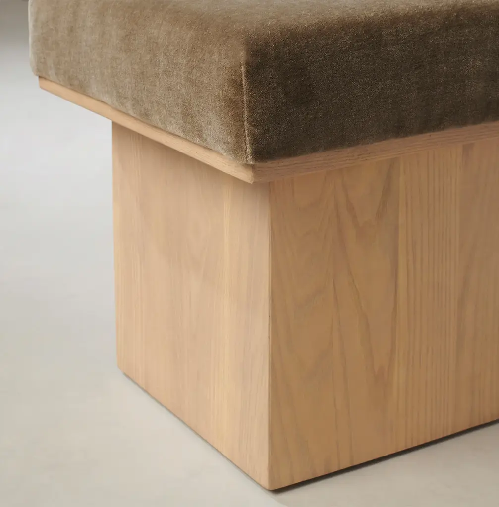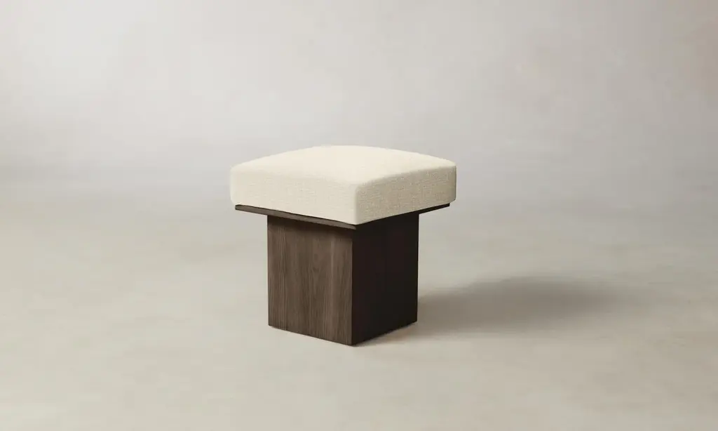 The Mulberry Ottoman's geometric silhouette exudes sophistication. It has a masterfully upholstered seat cushion that sits atop a striking ash pedestal base. Handcrafted in North Carolina.