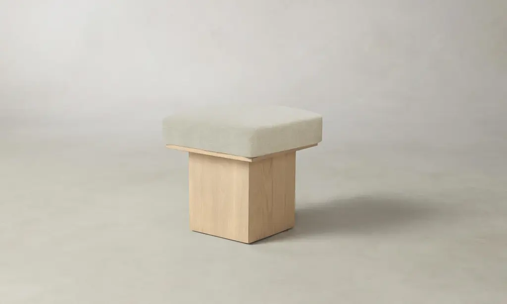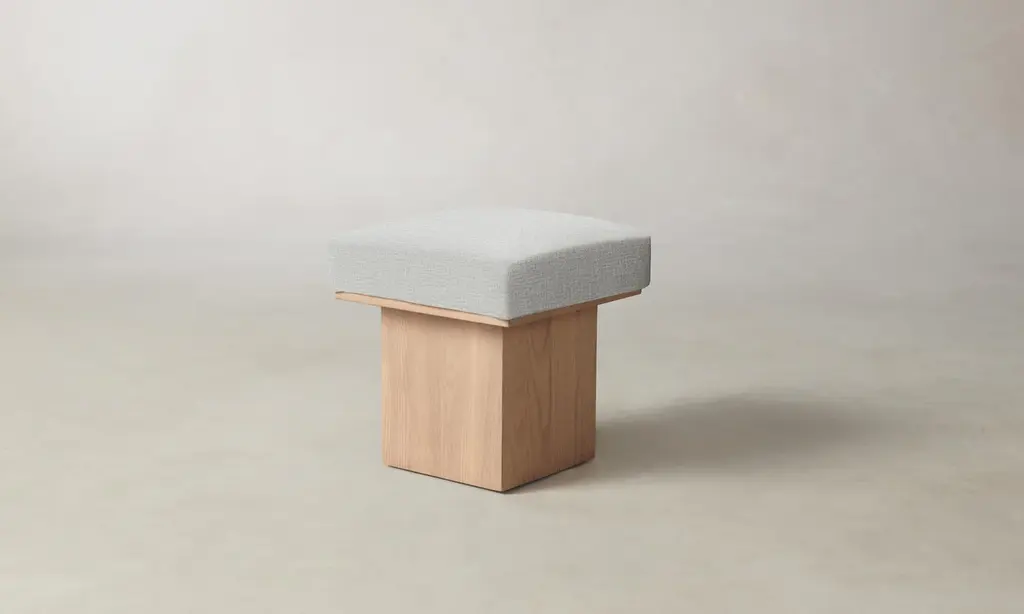 The Mulberry Ottoman's geometric silhouette exudes sophistication. It has a masterfully upholstered seat cushion that sits atop a striking ash pedestal base. Handcrafted in North Carolina.