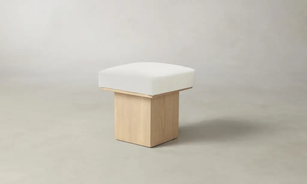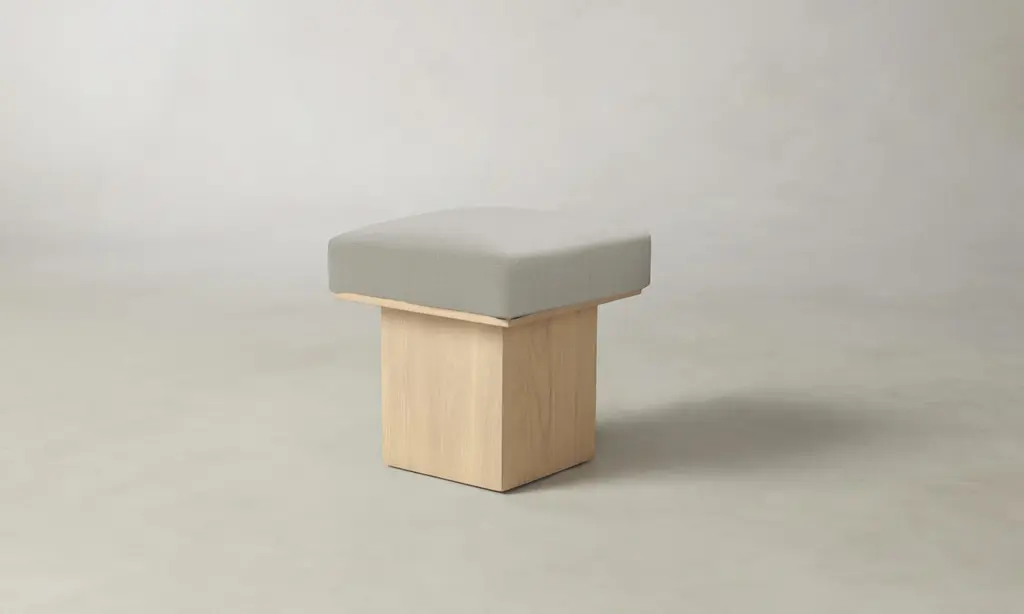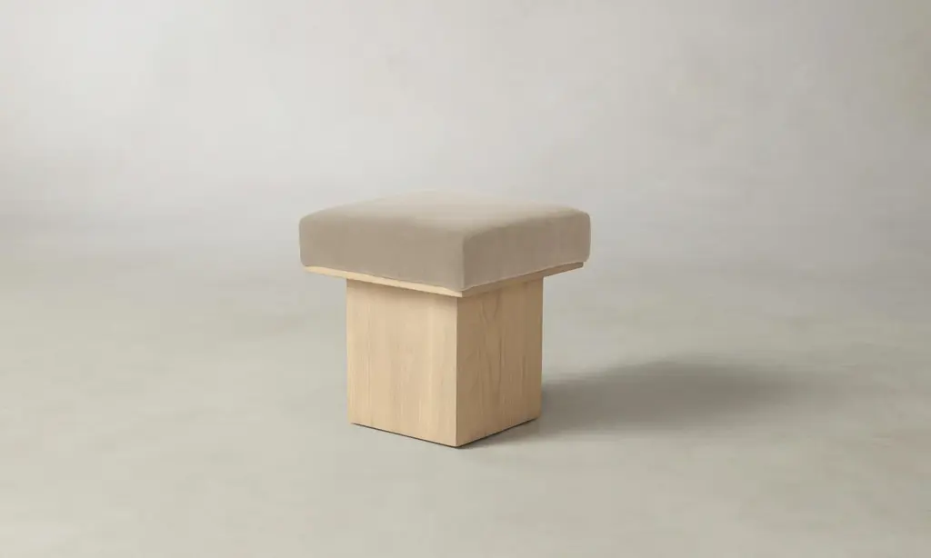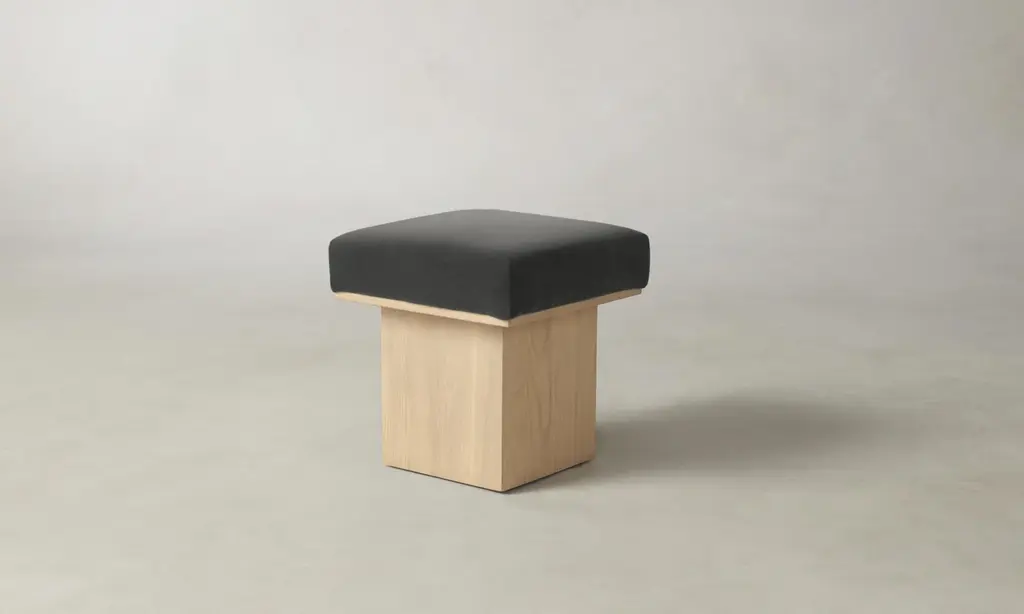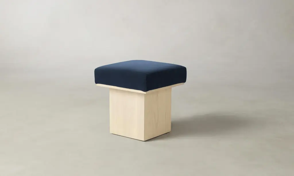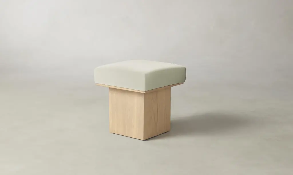 The Mulberry Ottoman's geometric silhouette exudes sophistication. It has a masterfully upholstered seat cushion that sits atop a striking ash pedestal base. Handcrafted in North Carolina.
