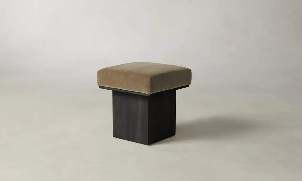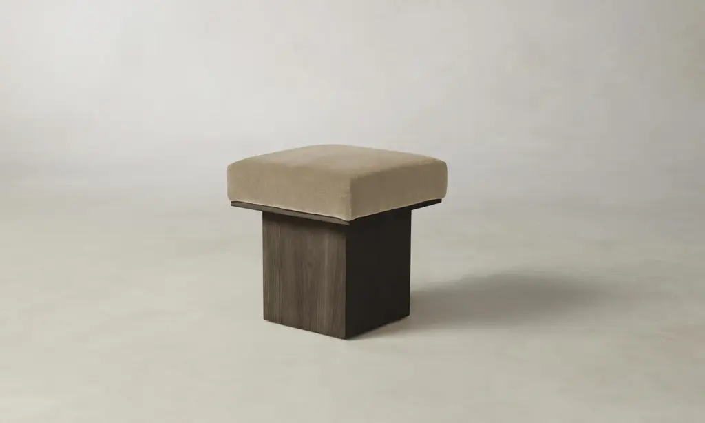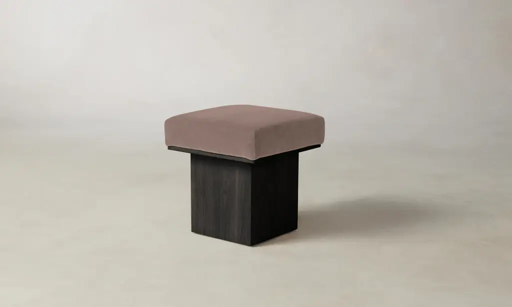The Mulberry Ottoman's geometric silhouette exudes sophistication. It has a masterfully upholstered seat cushion that sits atop a striking ash pedestal base. Handcrafted in North Carolina.