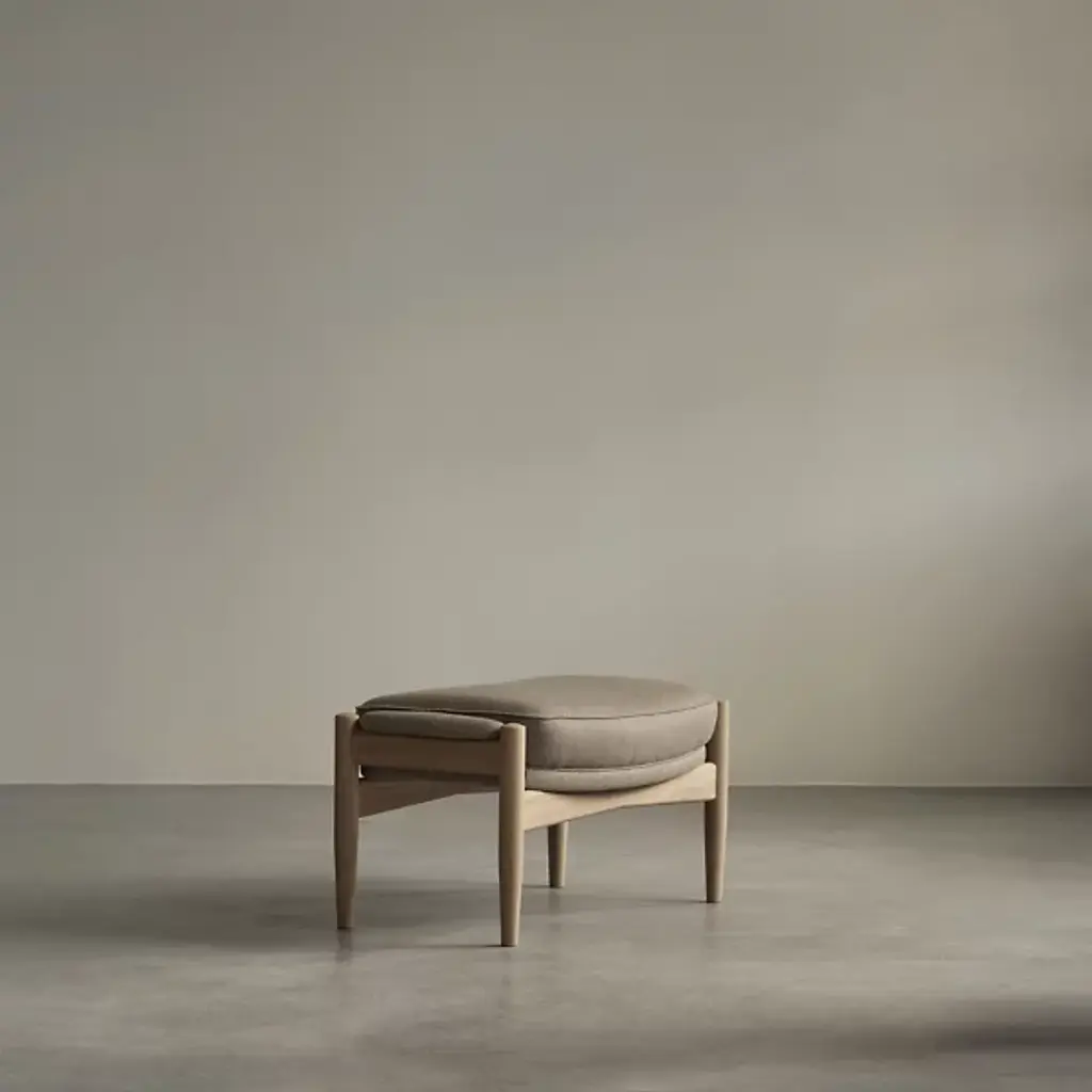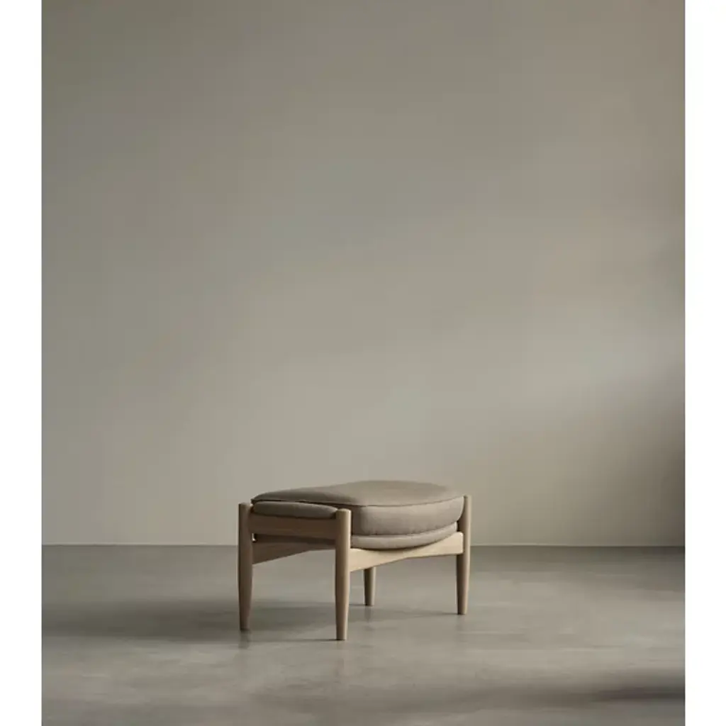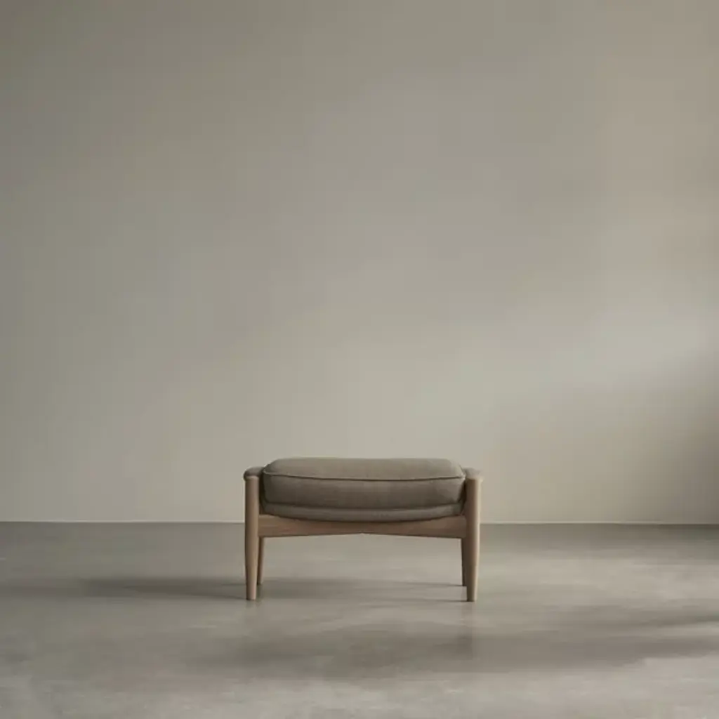 The Seal Ottoman from Audo Copenhagen, formerly Menu, offers a cozy companion to modern lounge seating. The iconic Danish designer Ib Kofod-Larsen, known for his Danish modern designs created a companion piece for the Seal chair, informed by his love for detail, proportion, and refinement. The ottoman can coordinate with the chair or complement other furnishings around it by sitting low to the ground with a clean mid-century silhouette, its robust wood frame adding a splash of organic presence and subtle accents that play beautifully against the refined upholstery on top. A soft cushion slots inside the smooth wooden contours with a button-like charm, its soft, supportive upholstery adding a final layer of casual comfort.