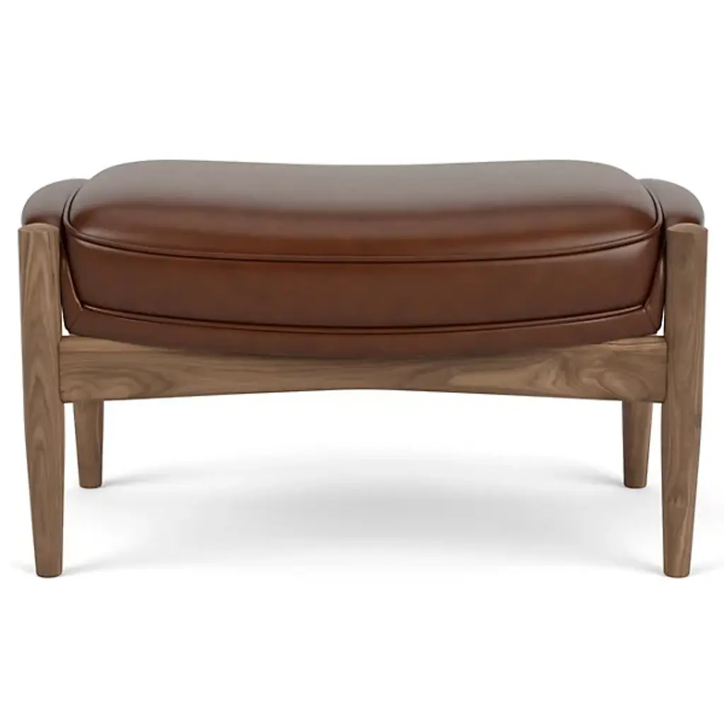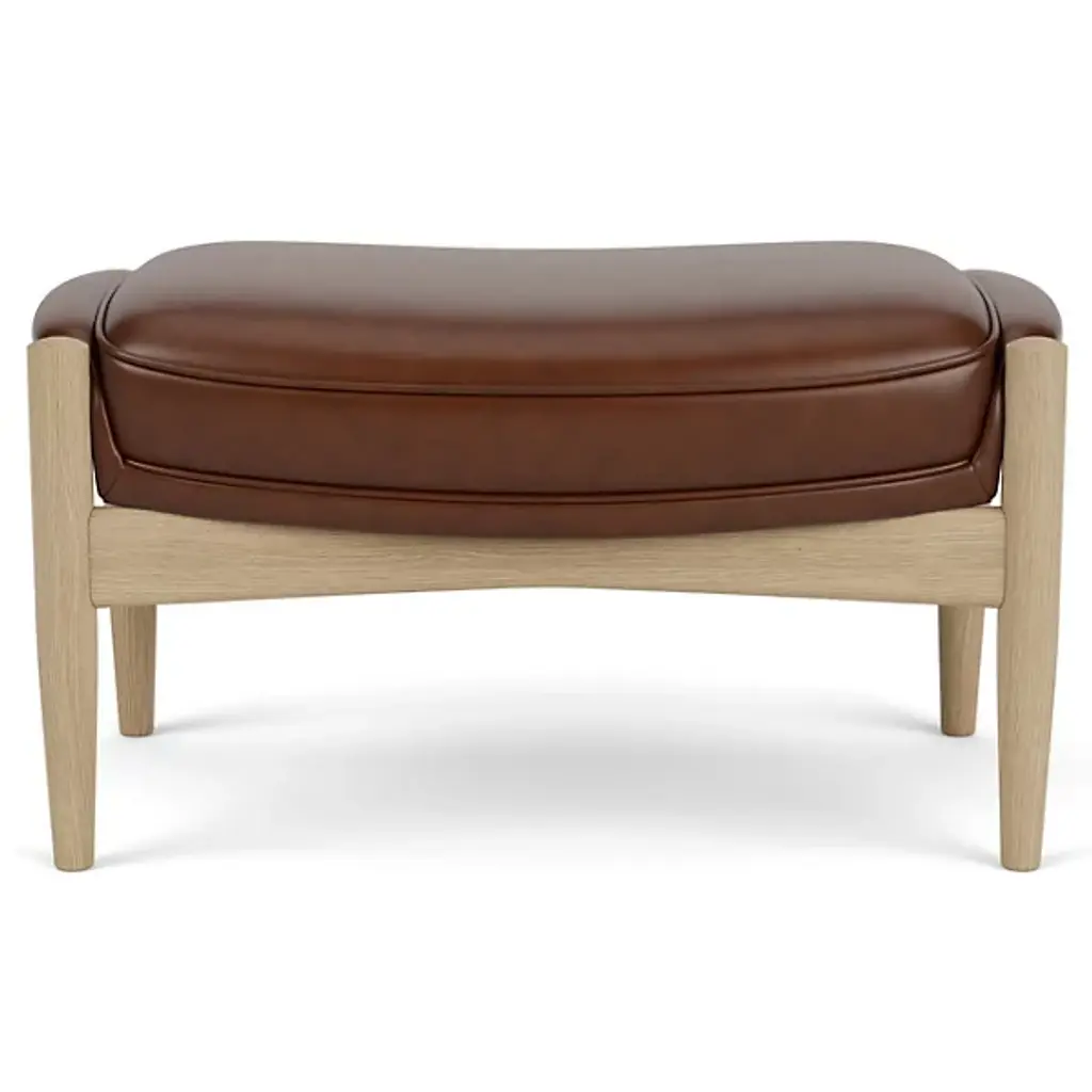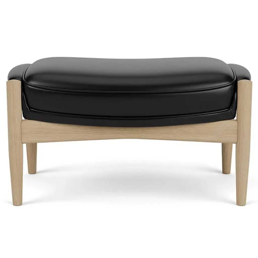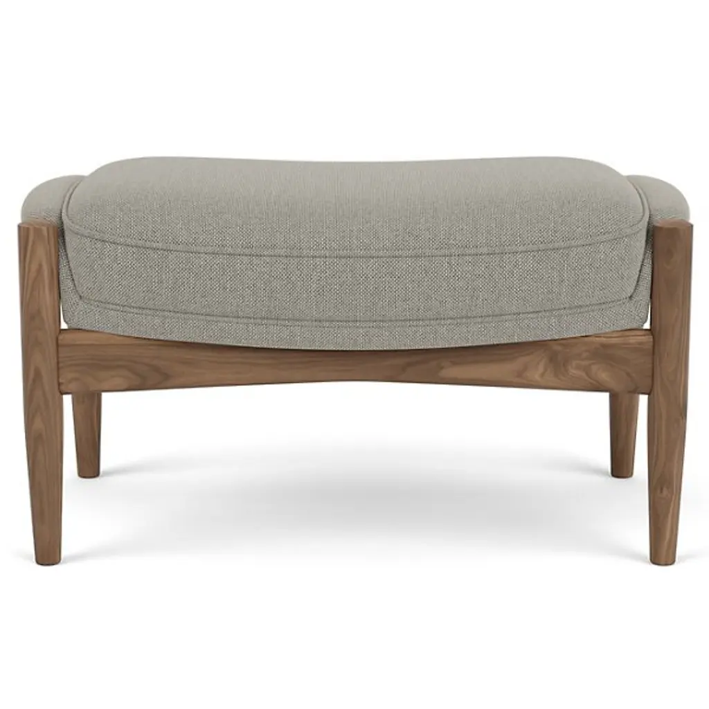 The Seal Ottoman from Audo Copenhagen, formerly Menu, offers a cozy companion to modern lounge seating. The iconic Danish designer Ib Kofod-Larsen, known for his Danish modern designs created a companion piece for the Seal chair, informed by his love for detail, proportion, and refinement. The ottoman can coordinate with the chair or complement other furnishings around it by sitting low to the ground with a clean mid-century silhouette, its robust wood frame adding a splash of organic presence and subtle accents that play beautifully against the refined upholstery on top. A soft cushion slots inside the smooth wooden contours with a button-like charm, its soft, supportive upholstery adding a final layer of casual comfort.
