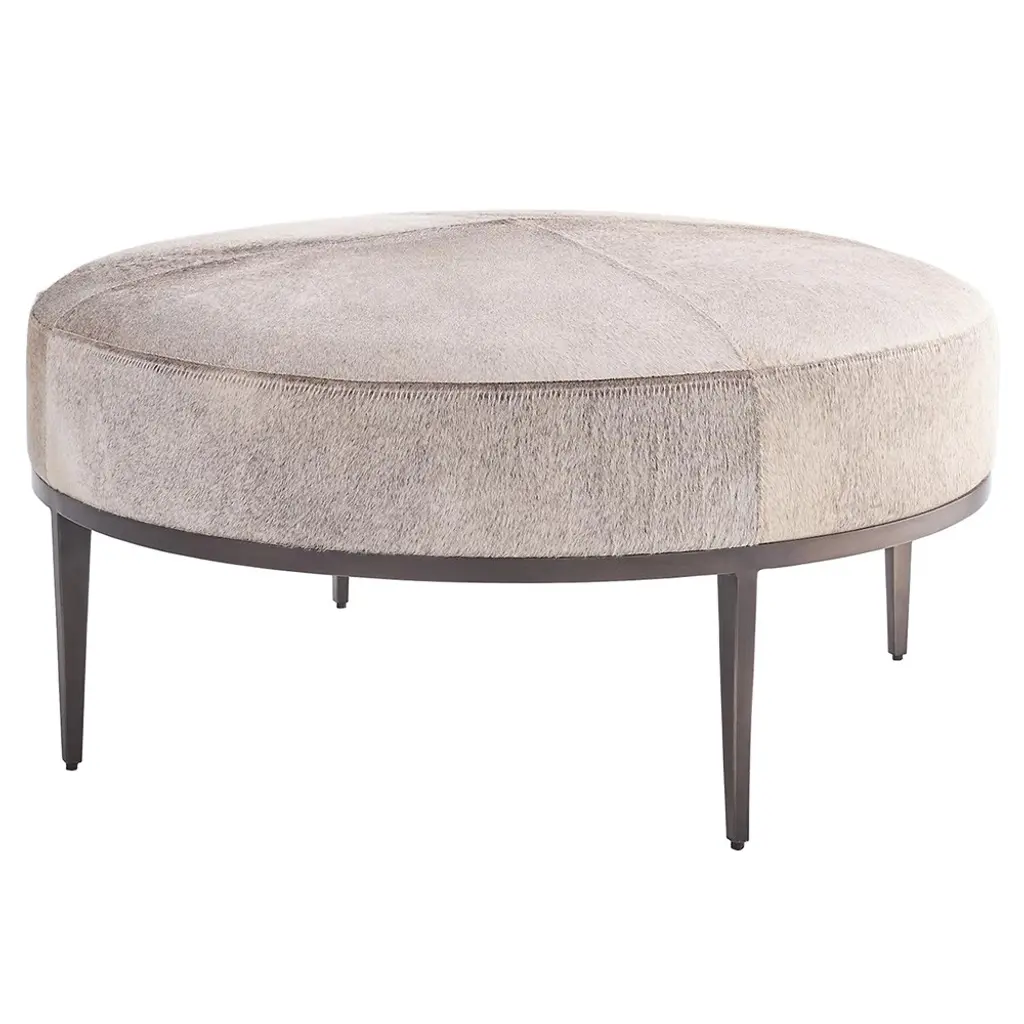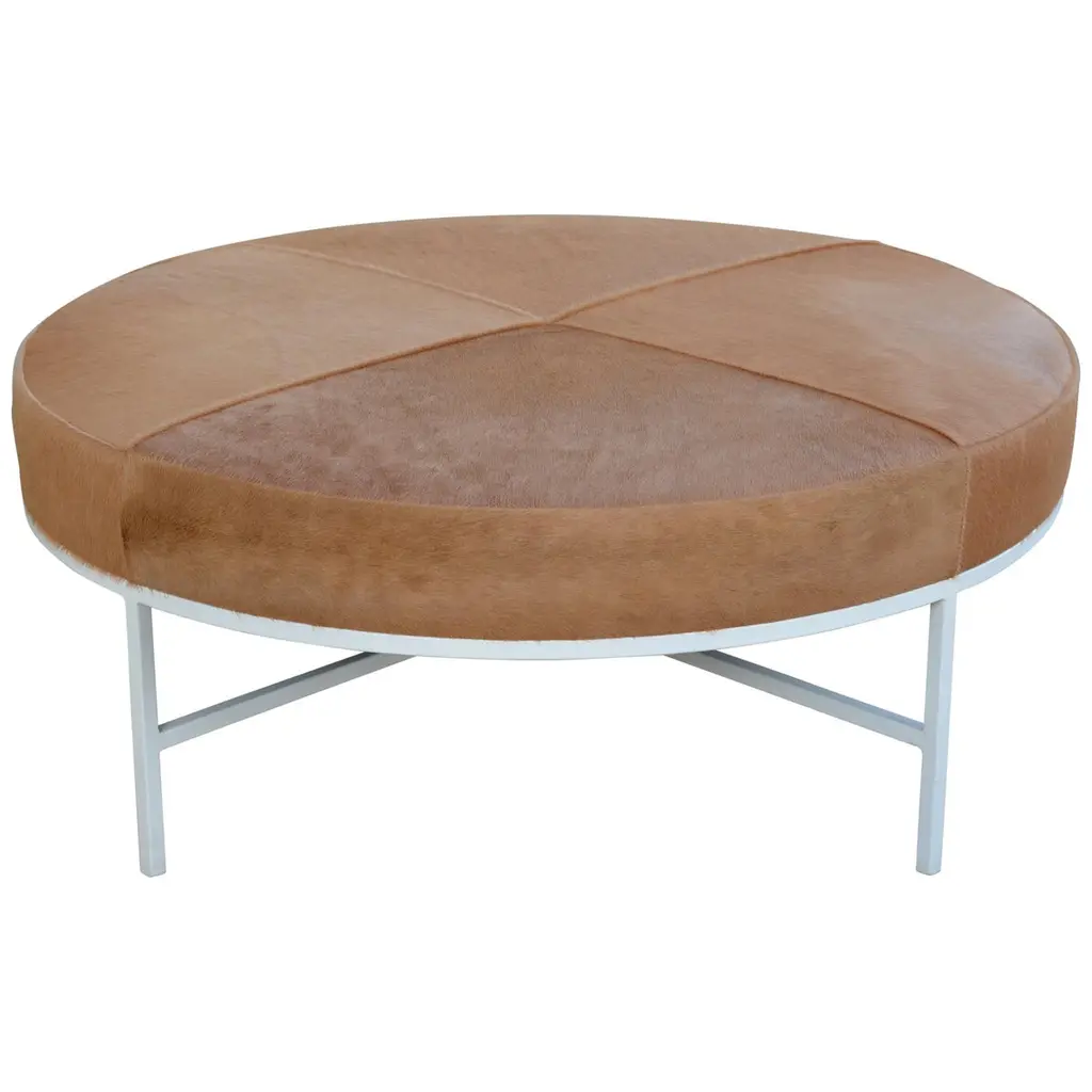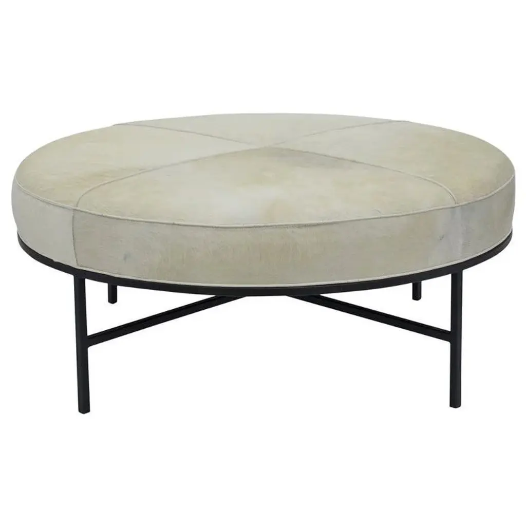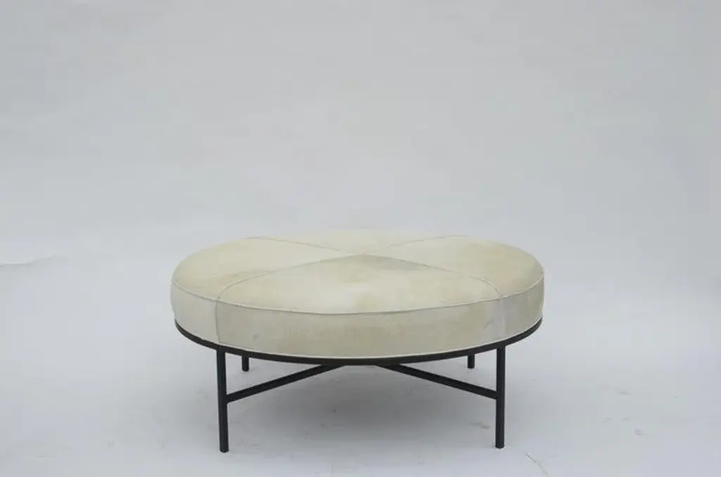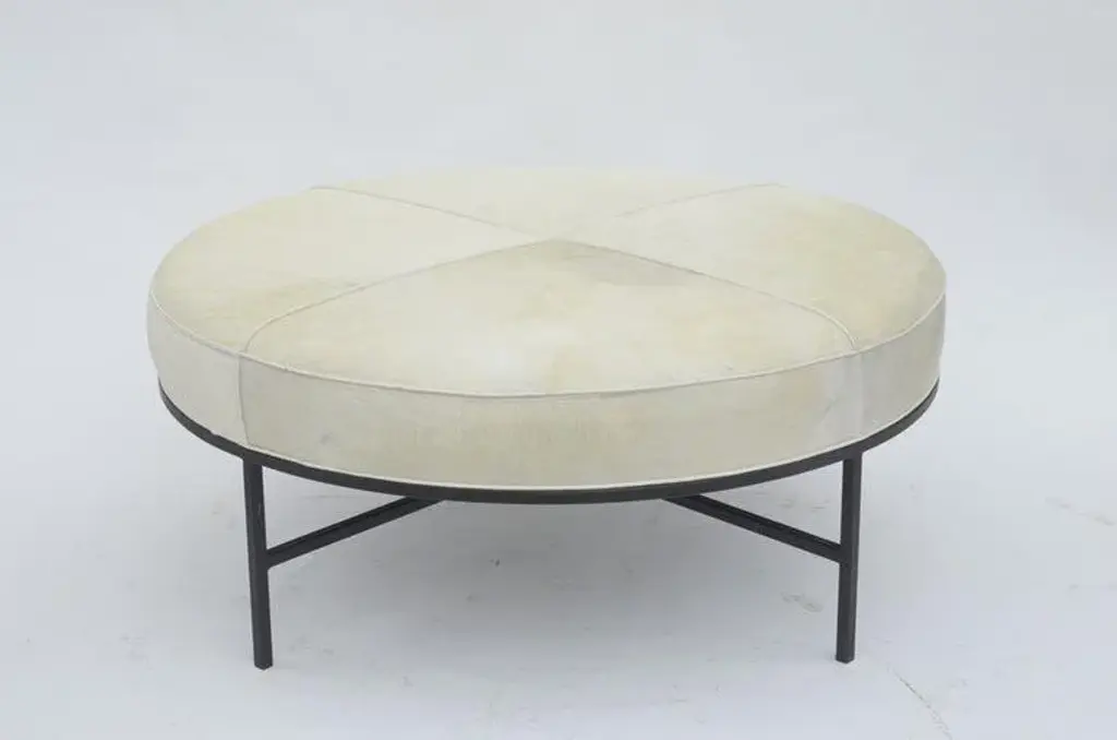 The ‘Tambour’ white hide and matte black ottoman. Beautiful alabaster white hide paired with a minimalist matte black metal base. Optional matching leather piping (shown with piping). Upholstered firm for seating or as a coffee table.