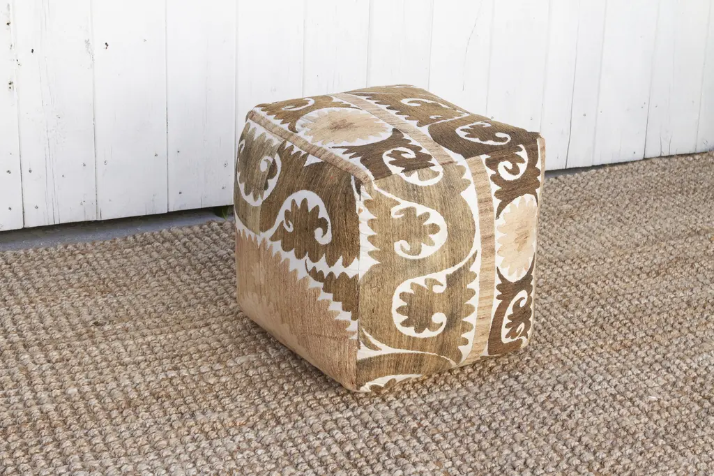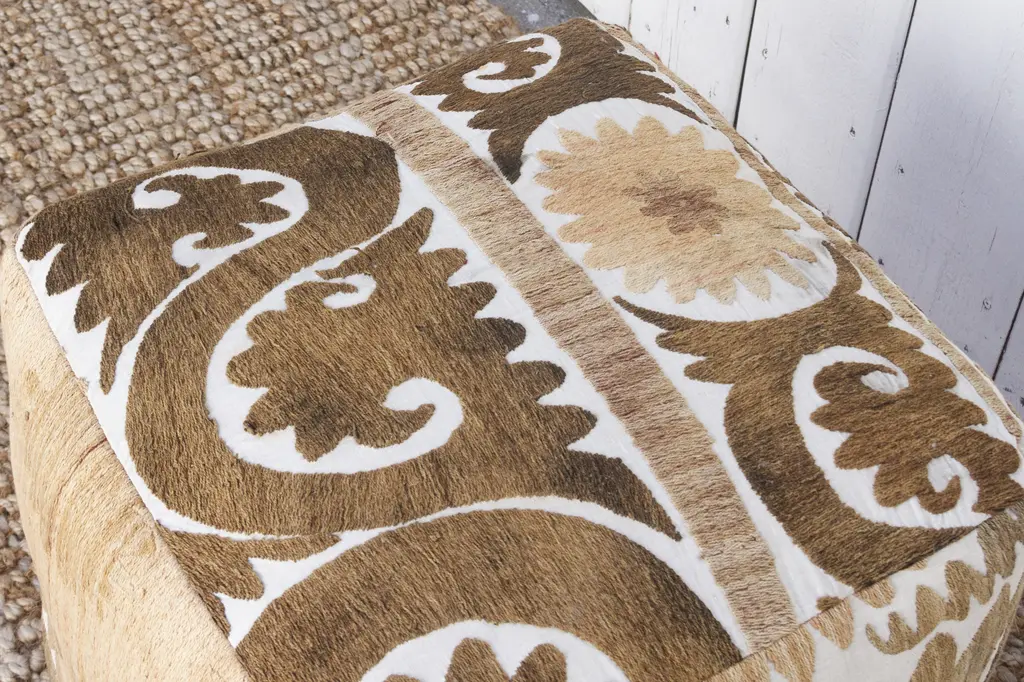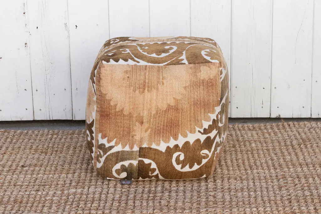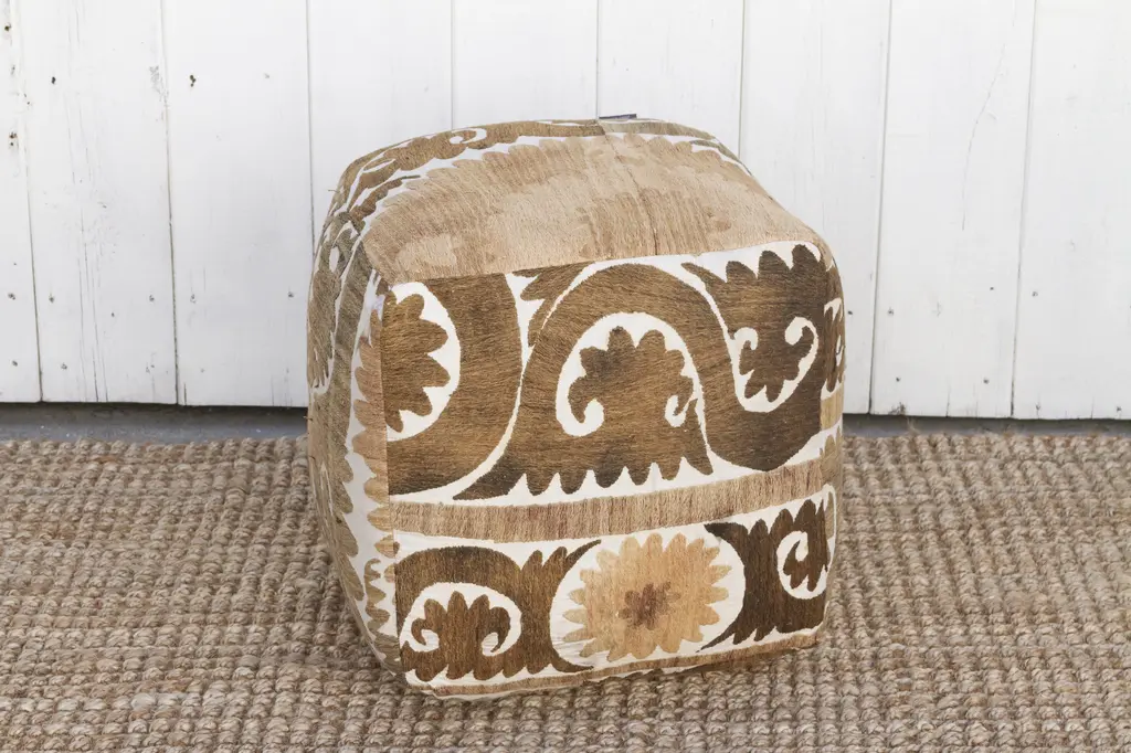 Our collection of Suzani ottomans offers a unique way to incorporate timeless beauty into your home. Suzani embroidery, traditionally crafted by women to adorn their homes and celebrate special occasions, is a breathtaking art form. We breathe new life into antique Suzani tapestries by transforming them into stunning square ottomans showing designs on all sides, with a durable base. Each piece boasts captivating, hand-stitched artistry featuring vibrant floral, leaf, and vine motifs.