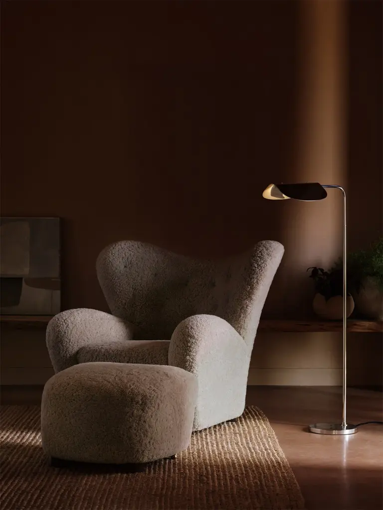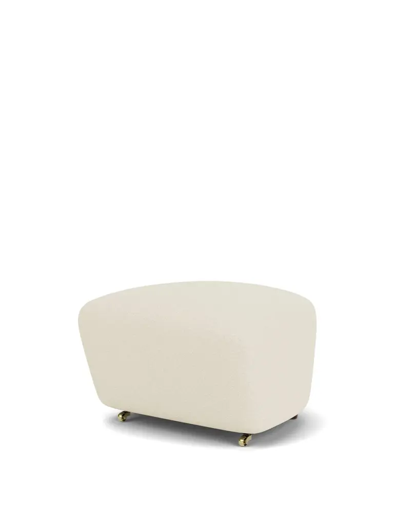 The Tired Man Ottoman has been designed from Flemming Lassen's original armchair. The soft lines and round shapes from the armchair is continued in the Ottoman. Relaunched in 2015, the award-winning design is offered in plush sheepskin in a nod to the original, and with natural or dark-oiled oak heartwood legs and front brass casters for easy movement.