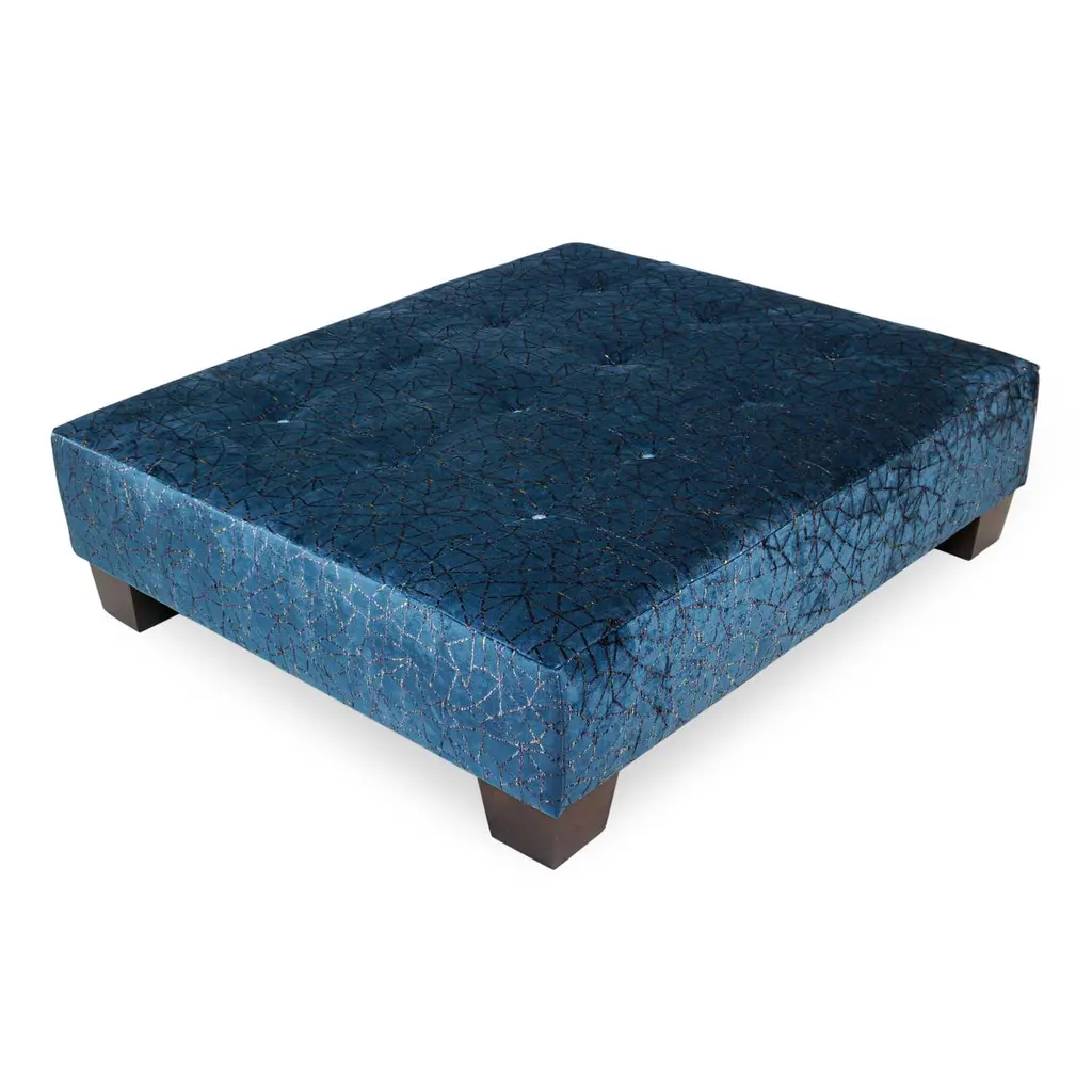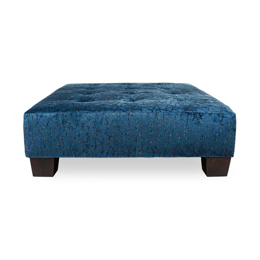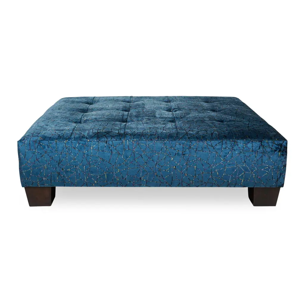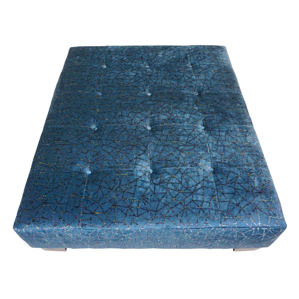 Transitional tufted ottoman in a modern shimmering blue cut velvet with metallic detail and thick stained maple feet. Frame made with solid hardwood and upholstered with eight-way hand-tied springs and high density foam. Firm enough to hold a tray for entertaining. Ask us about custom dimensions, fabric and finish.Overall: 60”W x 48”D x 16”HPrice As Shown: $5,570 eachCOM Price: $3,890 eachCustomization may change the price.How We Work:Made to order by Connecticut-based furniture design and manufacturing company The Tailored Home. Submit your customization desires by 1stdibs messenger for a quote. After orders are placed our workshop manager creates a visual work order for your approval for quality assurance.We accept inspiration photos of pieces you like.2023 - Made to Order9-10 weeks.