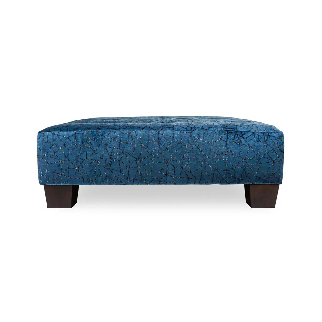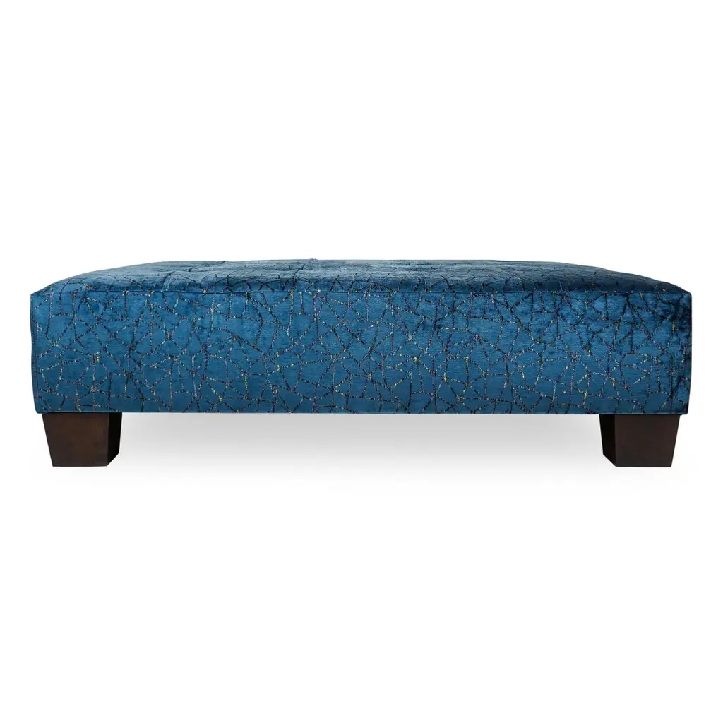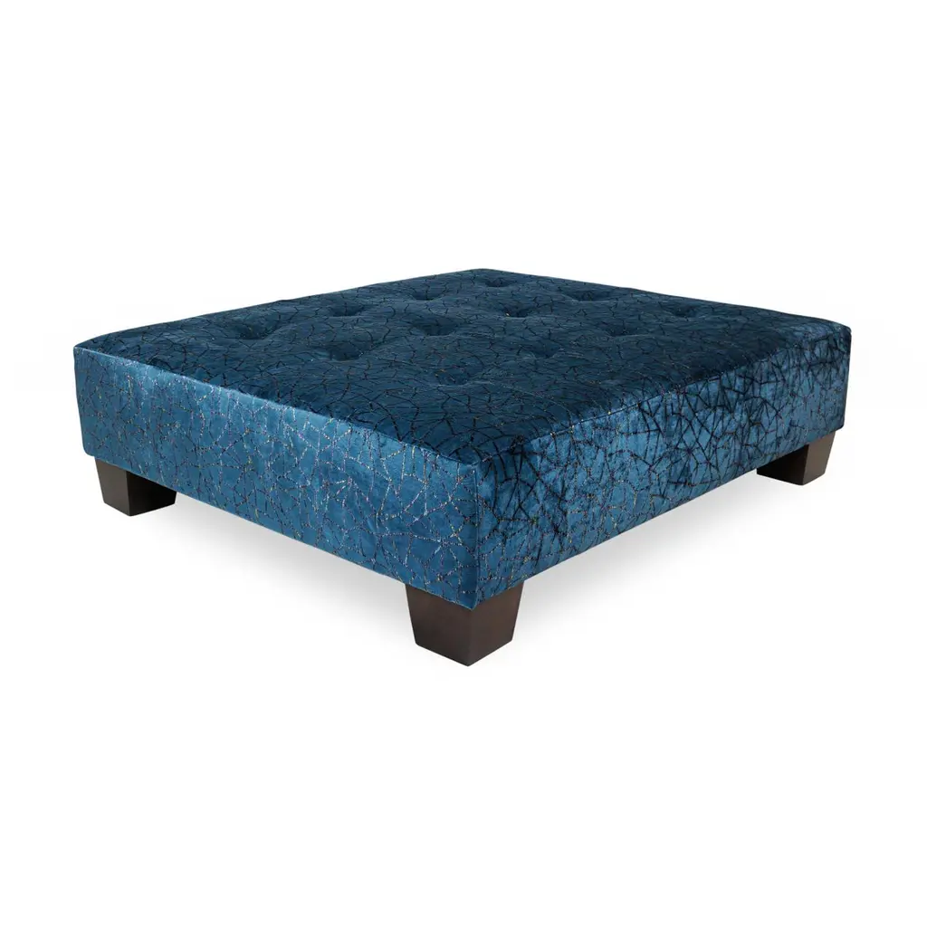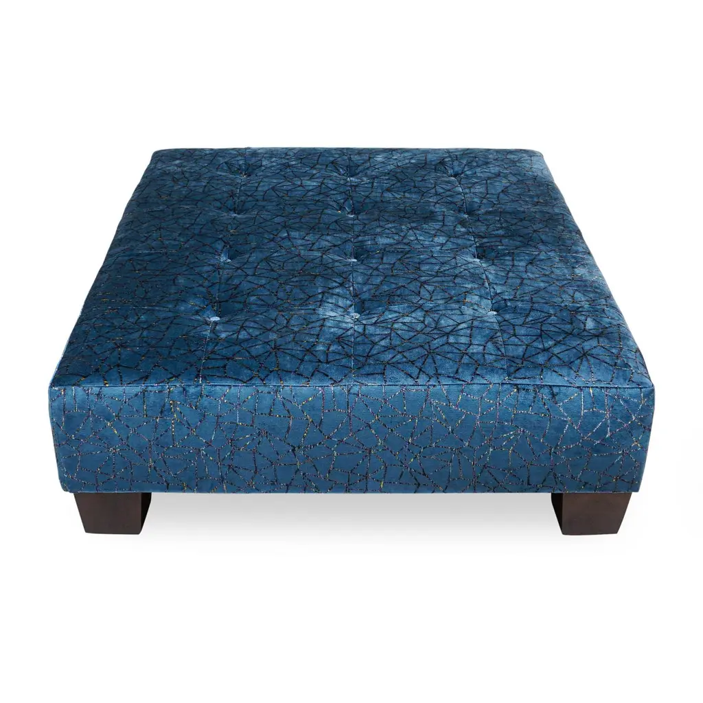 Transitional tufted ottoman in a modern shimmering blue cut velvet with metallic detail and thick stained maple feet. Frame made with solid hardwood and upholstered with eight-way hand-tied springs and high density foam. Firm enough to hold a tray for entertaining. Ask us about custom dimensions, fabric and finish.Overall: 60”W x 48”D x 16”HPrice As Shown: $5,570 eachCOM Price: $3,890 eachCustomization may change the price.How We Work:Made to order by Connecticut-based furniture design and manufacturing company The Tailored Home. Submit your customization desires by 1stdibs messenger for a quote. After orders are placed our workshop manager creates a visual work order for your approval for quality assurance.We accept inspiration photos of pieces you like.2023 - Made to Order9-10 weeks.