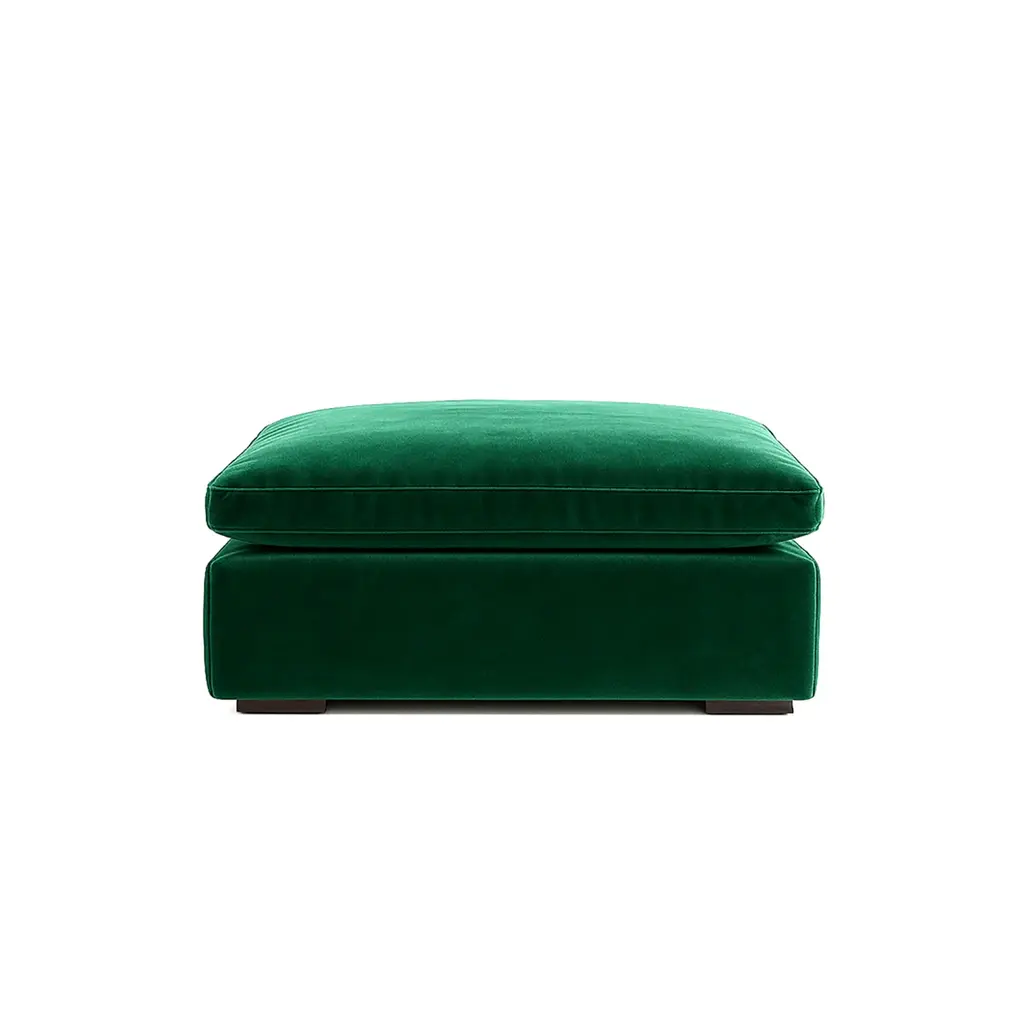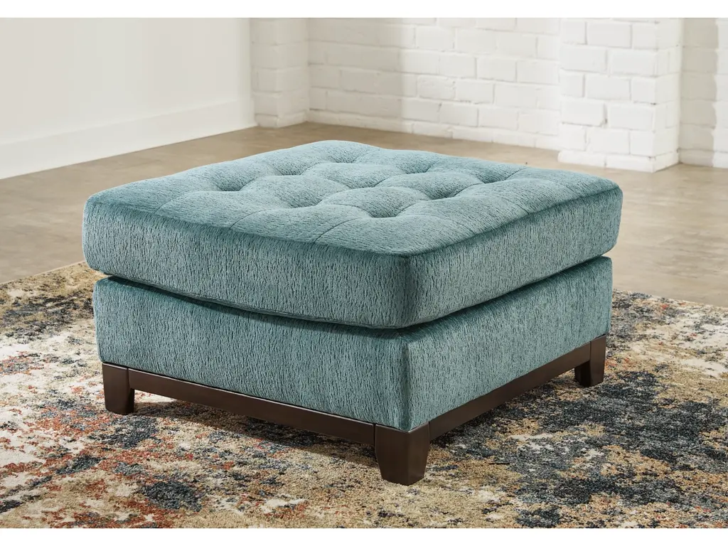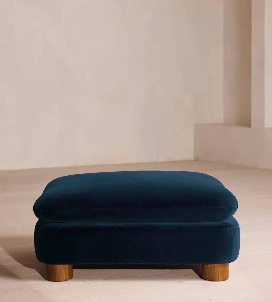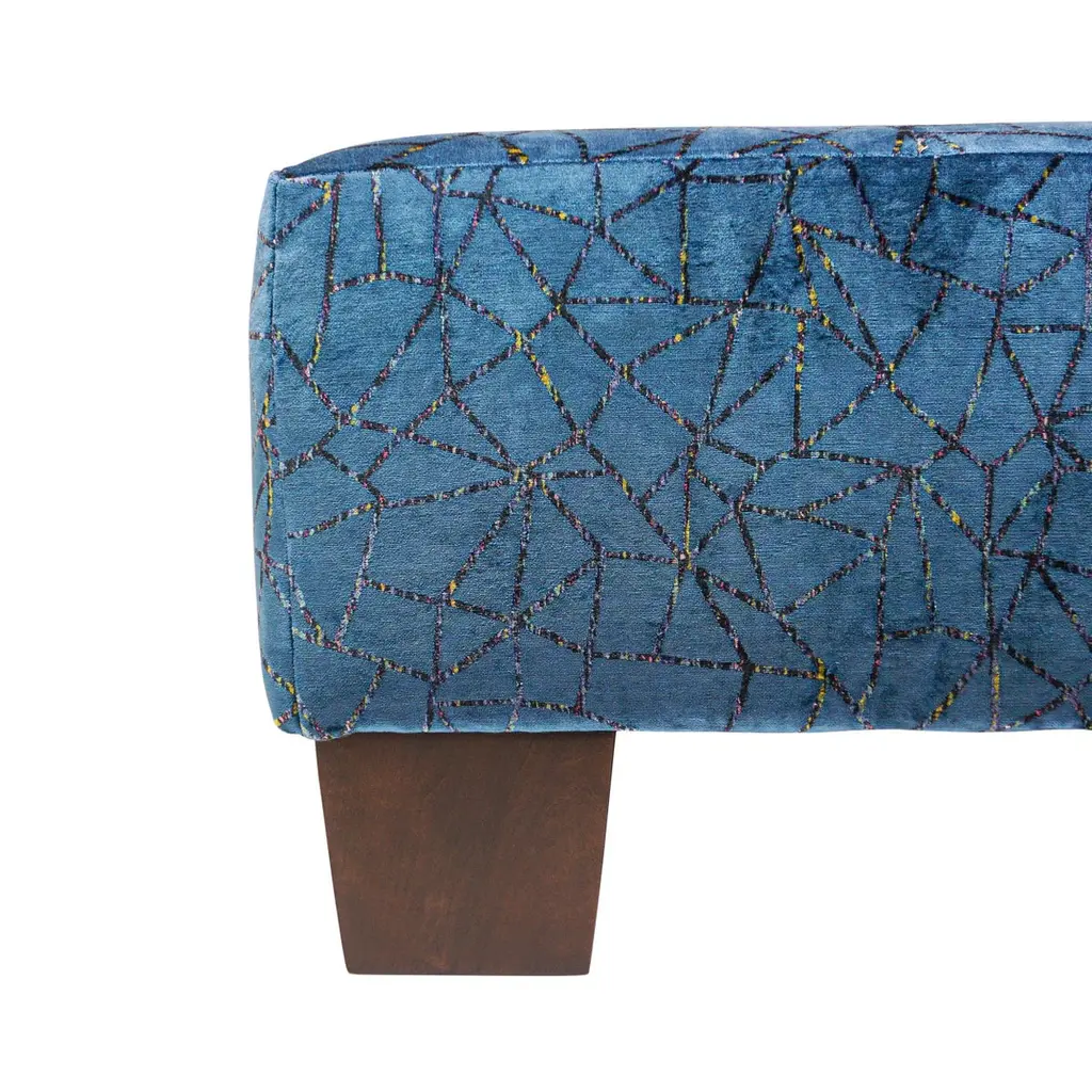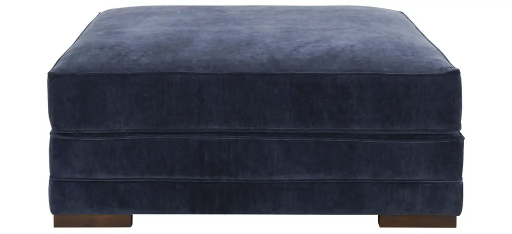Transitional tufted ottoman in a modern shimmering blue cut velvet with metallic detail and thick stained maple feet. Frame made with solid hardwood and upholstered with eight-way hand-tied springs and high density foam. Firm enough to hold a tray for entertaining. Ask us about custom dimensions, fabric and finish.Overall: 60”W x 48”D x 16”HPrice As Shown: $5,570 eachCOM Price: $3,890 eachCustomization may change the price.How We Work:Made to order by Connecticut-based furniture design and manufacturing company The Tailored Home. Submit your customization desires by 1stdibs messenger for a quote. After orders are placed our workshop manager creates a visual work order for your approval for quality assurance.We accept inspiration photos of pieces you like.2023 - Made to Order9-10 weeks.