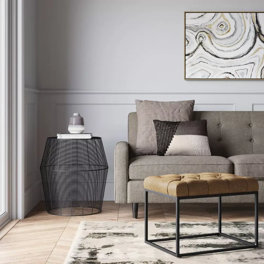 Add extra seating to your living room, TV room or den with the sleek and stylish Trubeck Faux-Leather Tufted Metal Base Ottoman from Threshold™. Featuring a foam-filled tufted seat and a sleek, open powder-coated metal frame, this upholstered ottoman offers you or your guests a luxurious seating experience. The tufted faux-leather seat adds a little texture to your living space, while the solid metal base in a gold tone provides a durable and elegant construction. From acting as a spare seat for guests to doubling as a handy footrest, this tufted faux-leather ottoman will make a stylish addition to your space. Threshold™: Looks like home, feels like you.