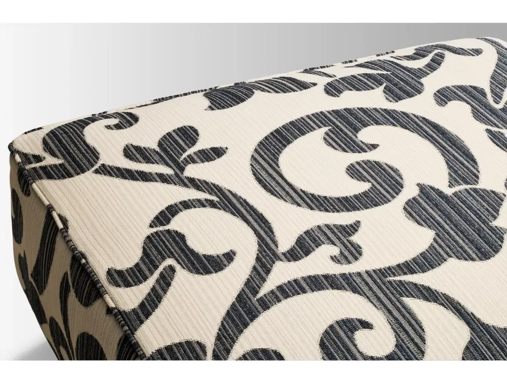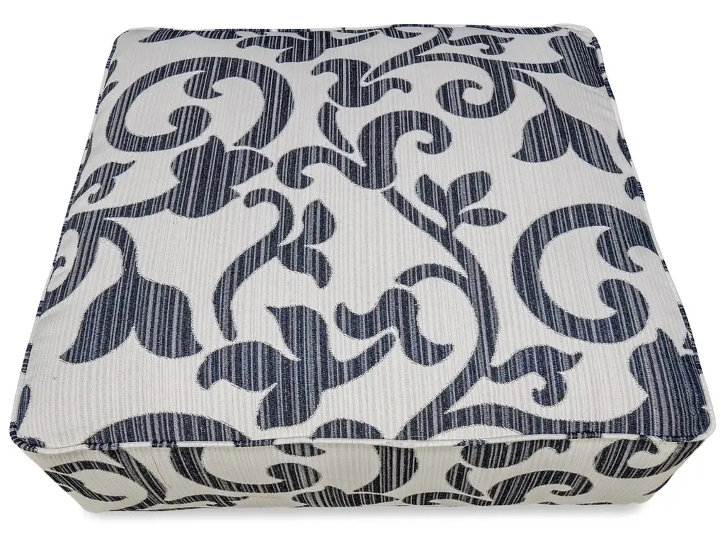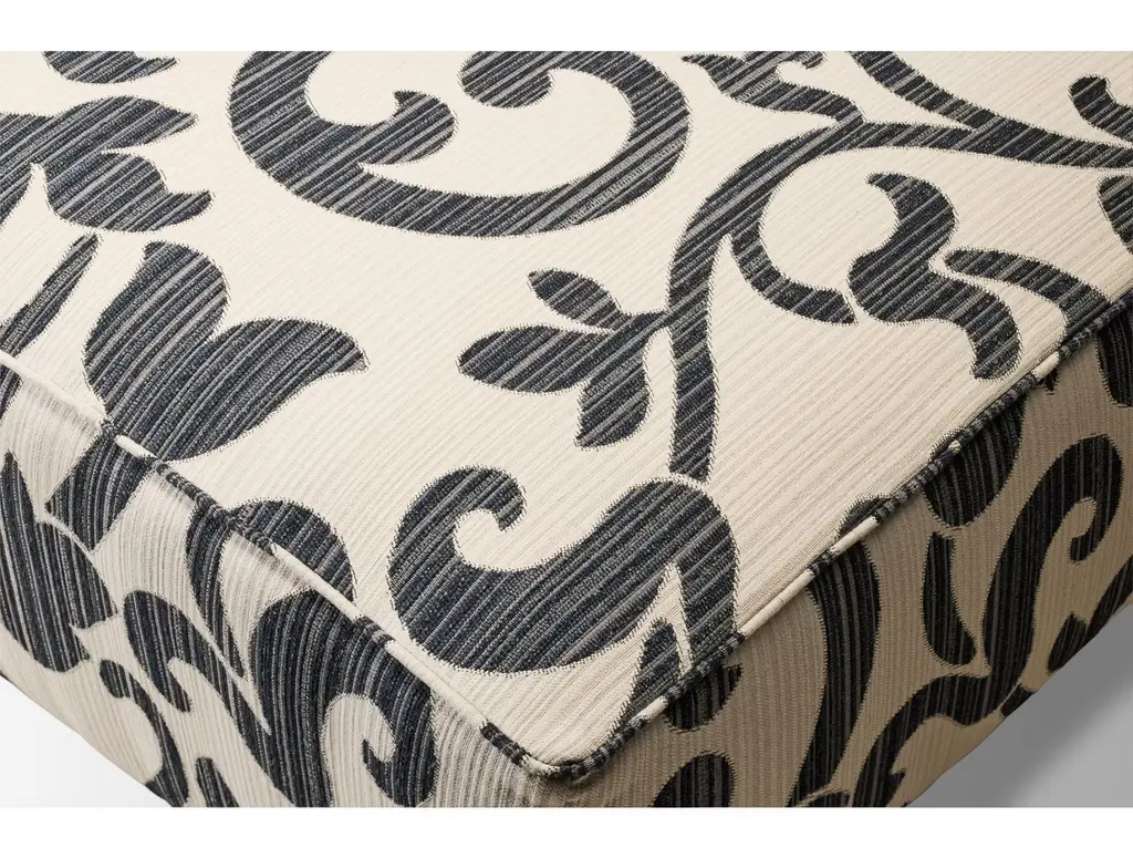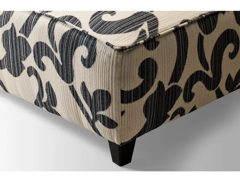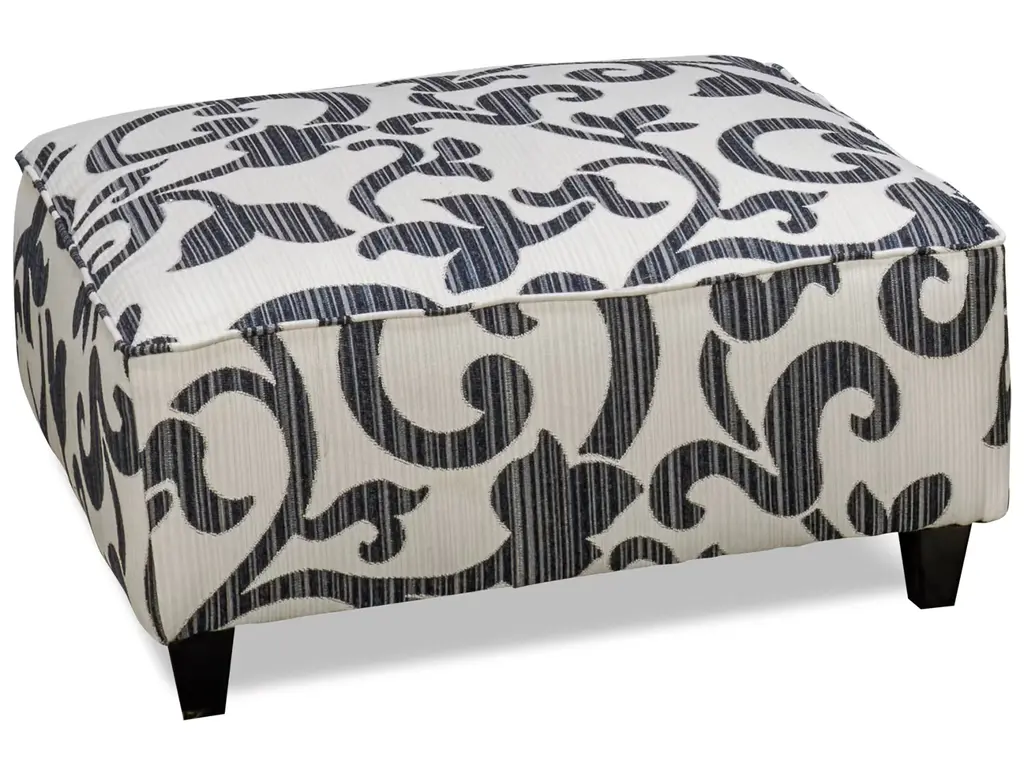 The Truth Cocktail Ottoman from Fusion Furniture will add style and comfort to your living room, den or bedroom. This transitional-style ottoman features a square profile, square tapered legs, and Sonata navy upholstery in a vine pattern.