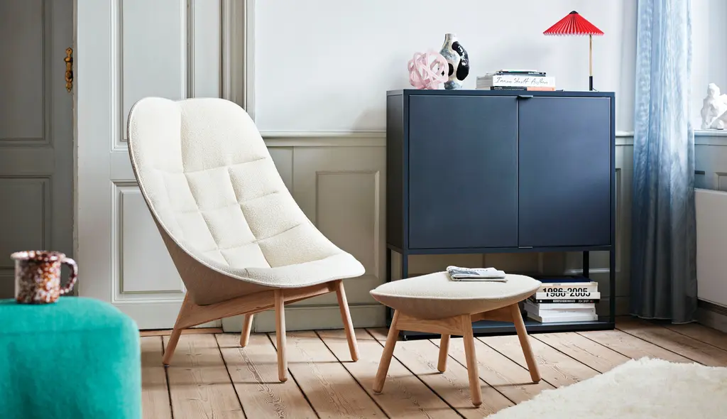 Inspired by the traditional Japanese hand fan, the Uchiwa Ottoman is a comfortable companion to its coordinating lounge chair. It’s upholstered in both fabric and leather for a contrast in color and texture.