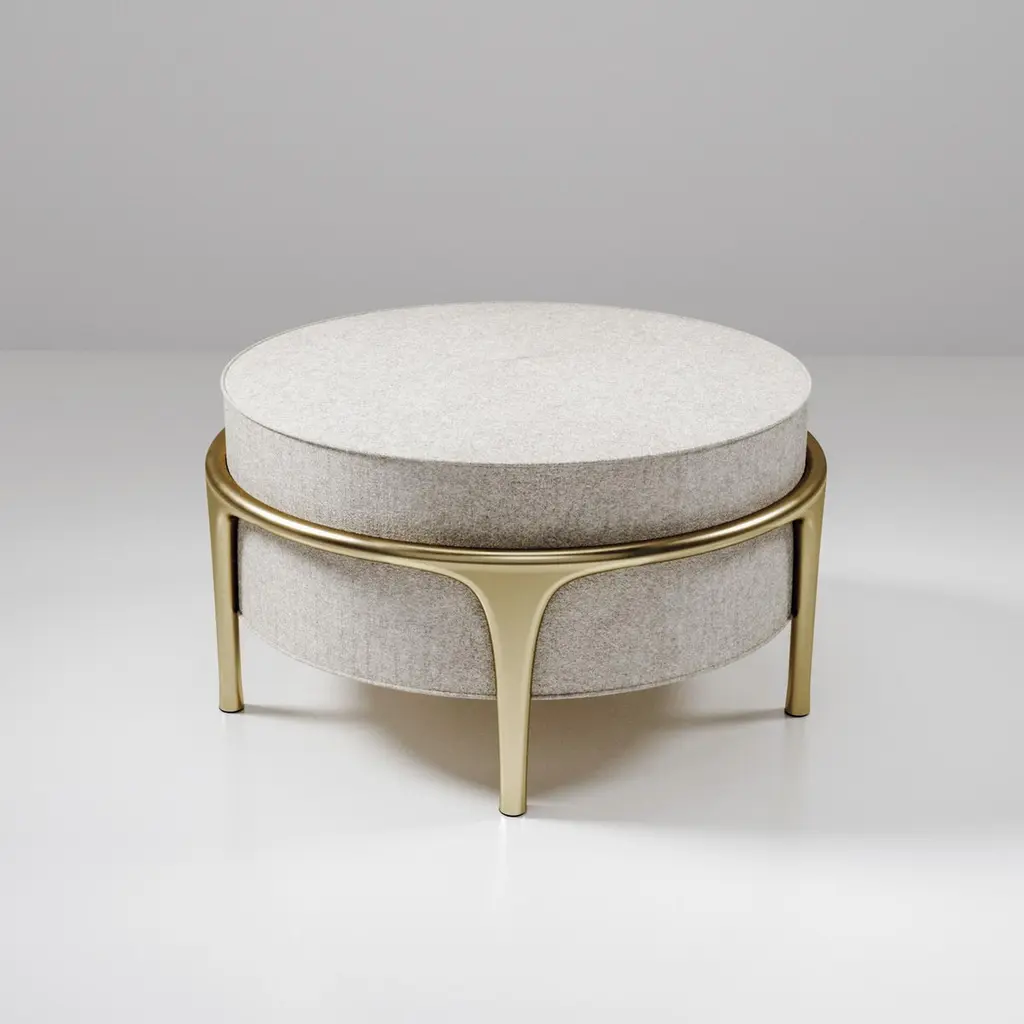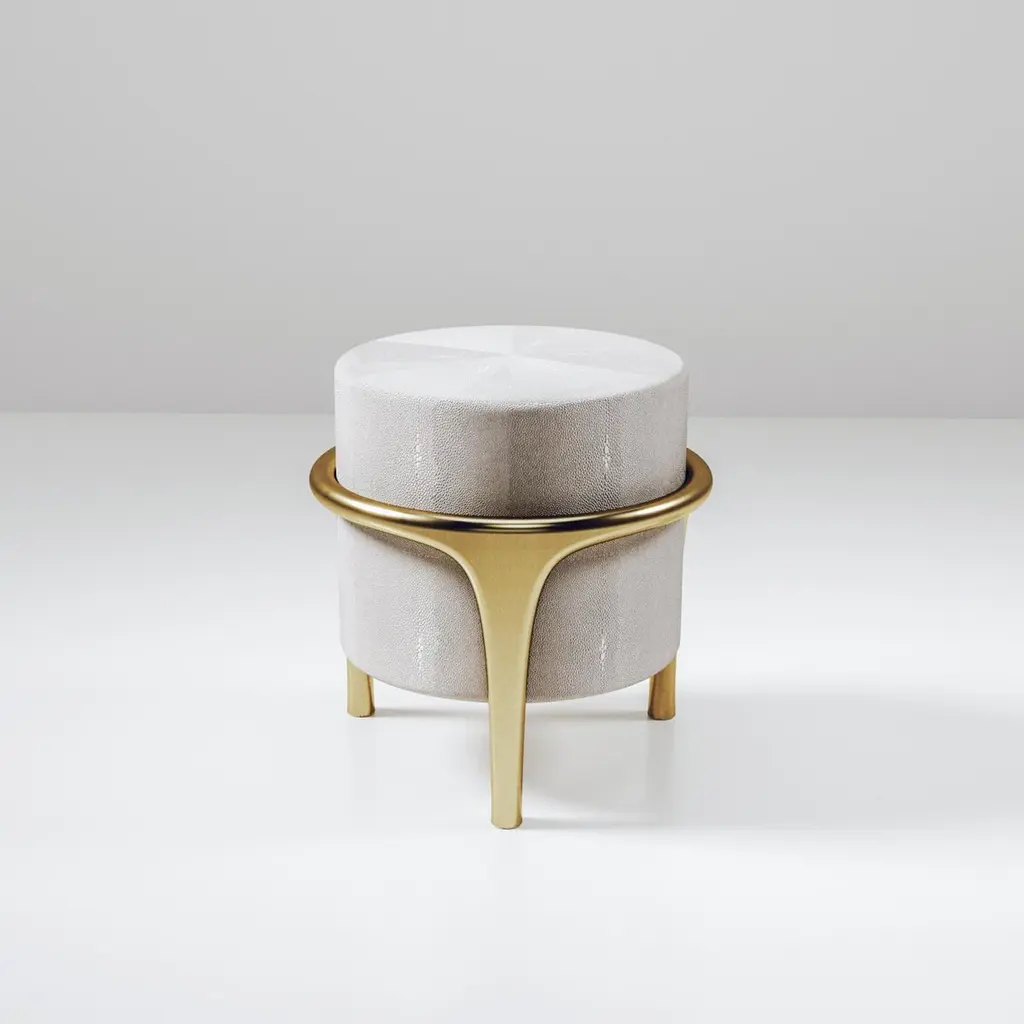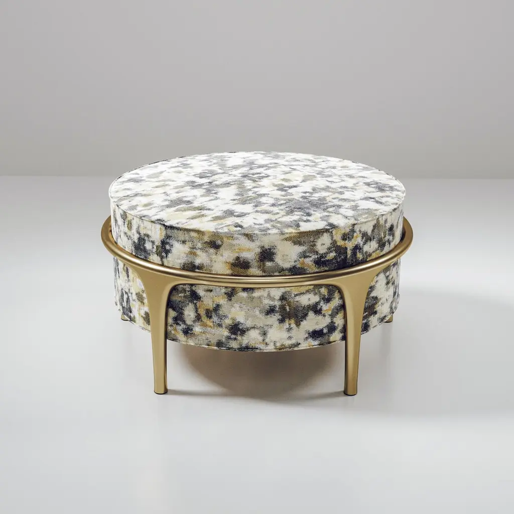 The Paris based label has distinguished themselves since their launch, with their iconic use of shagreen mixed with brass and other exotic materials. All furniture is handcrafted by skilled artisans, ultimately making each piece unique, designed in Paris and produced in the Philippines.The Ramo Ottoman by R & Y Augousti is an elegant and versatile piece. The upholstered piece in a camouflage Pierre Frey fabric provides comfort while retaining a unique aesthetic with the bronze-patina brass frame and details. This listing is priced for our fabric supply, see other listings for pricing of client COM and shagreen inlay. Part of the Ramo Seating Series, see images at end of slide.The dimensions of this piece are :Ottoman- Overall diameter 86.0 cm height 45.0 cmAll R & Y Augousti pieces are handmade by artisans, ultimately making each piece unique.Wipe clean with soft dry cloth.Acclaimed design duo Ria & Yiouri Augousti have established themselves since the 1990s as pioneers of modern-vintage style through their luxurious Art Deco inspired collections.The Paris based label has distinguished themselves since their launch, with their iconic use of shagreen mixed with brass and other exotic materials. All furniture is handcrafted by skilled artisans, ultimately making each piece unique. All shagreen-covered items should be kept out of direct sunlight, color variants may occur on the stingray and other exotic finishes, but this showcases the Parisian label's commitment to creating authentic luxurious products using natural components.