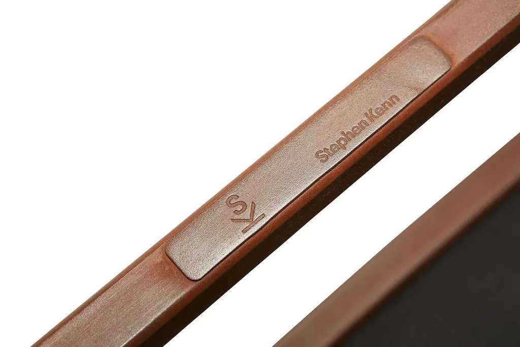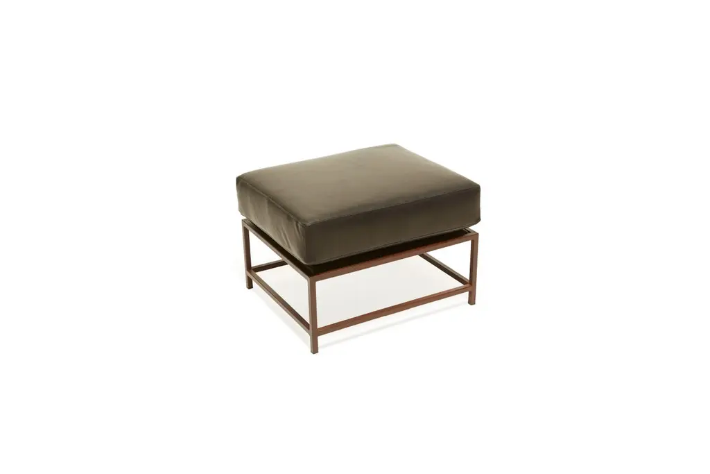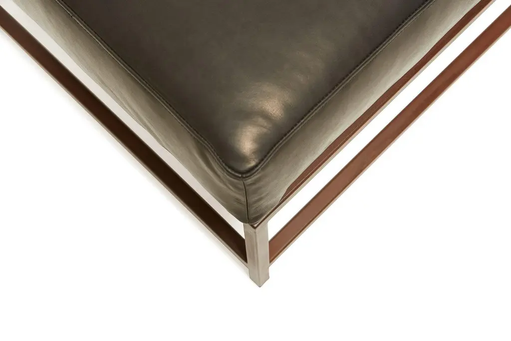Designed to pair with any of the inheritance seating options, the ottoman is a great addition to add a lounge element to your seating arrangement. This variation is upholstered in a deep, dark granite leather. The foam seat cushions have been wrapped in down allowing for a soft and comfortable lounge experience, and sits atop a marbled rust frame.Every Stephen Kenn piece is made to order through our Los Angeles studio.
