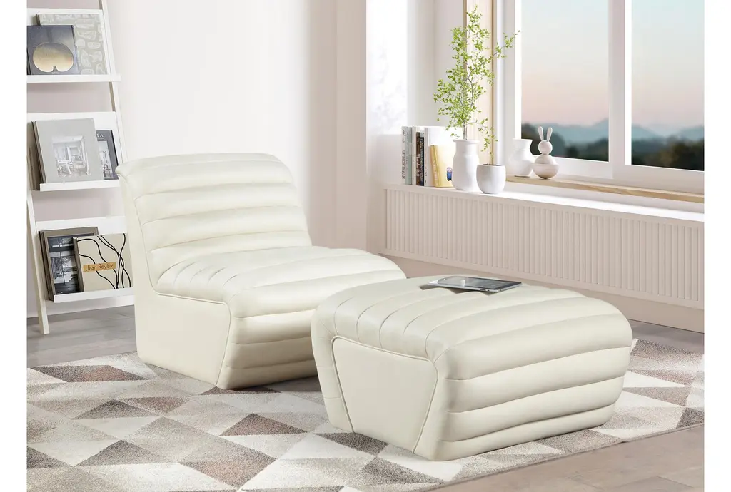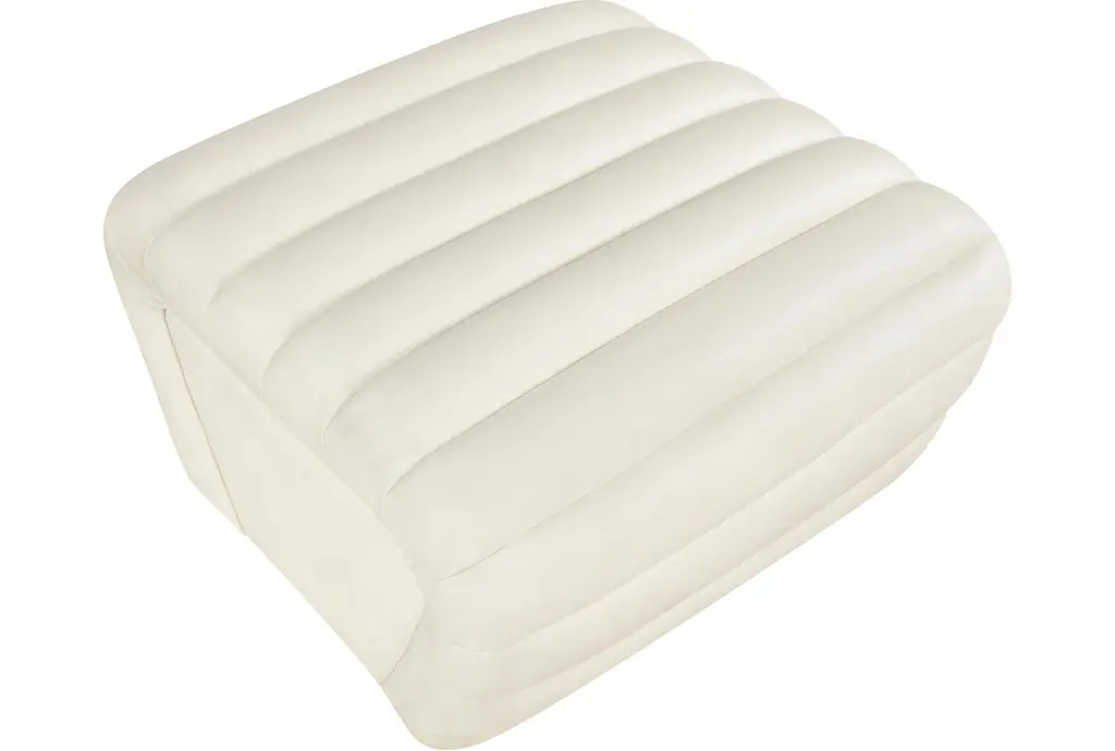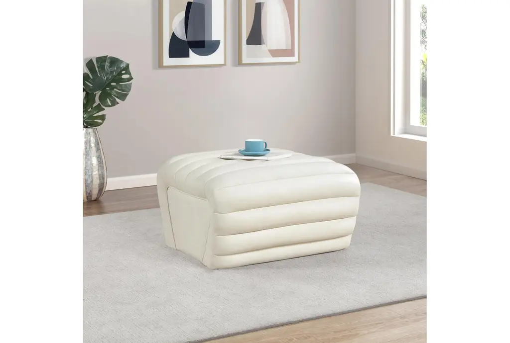 The Vega Cream Faux Leather Upholstered Ottoman is a stylish addition to any living room. Its modern design and soft cream color make it a versatile piece that complements a variety of decor styles. The quilted fabric adds a touch of texture and comfort, making it perfect for relaxing.