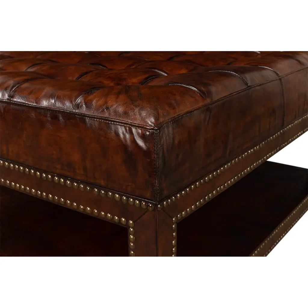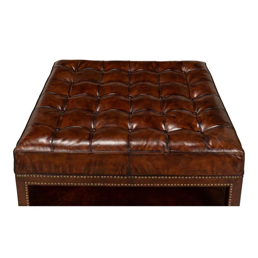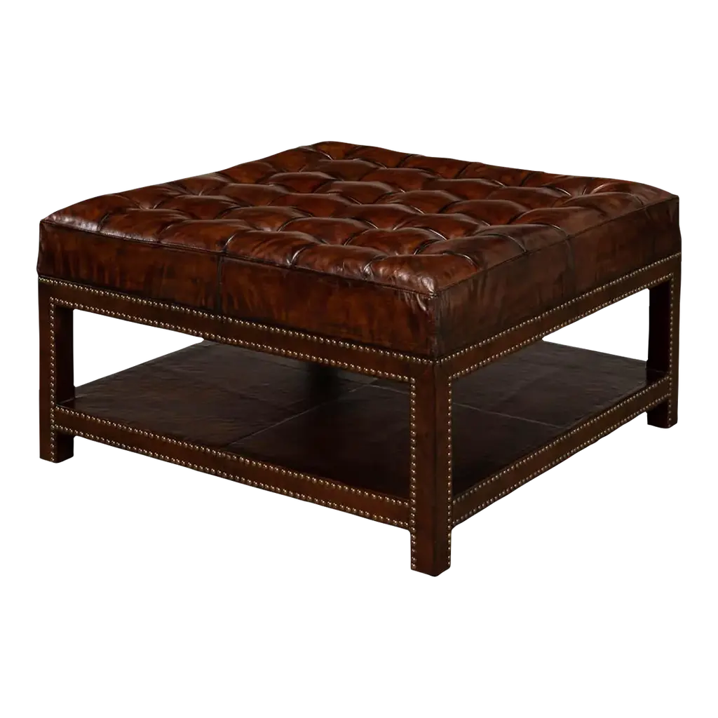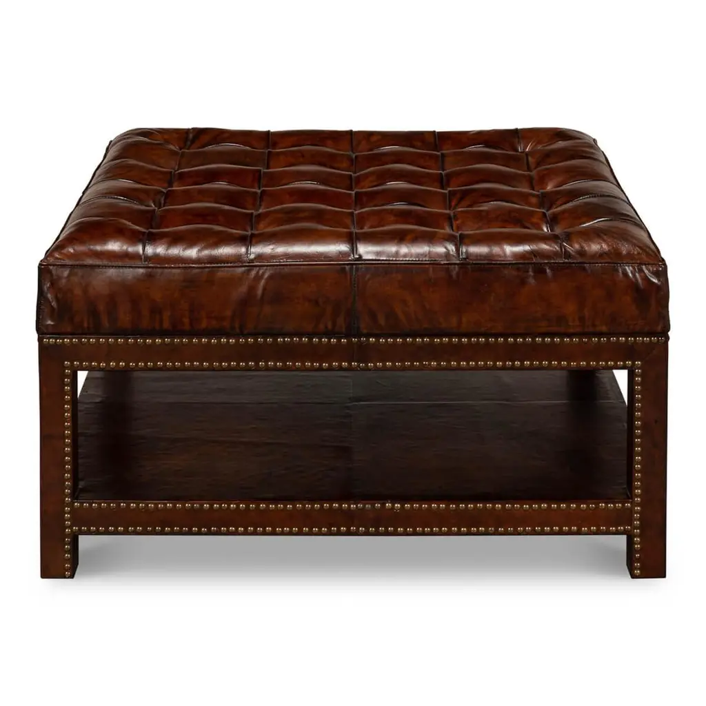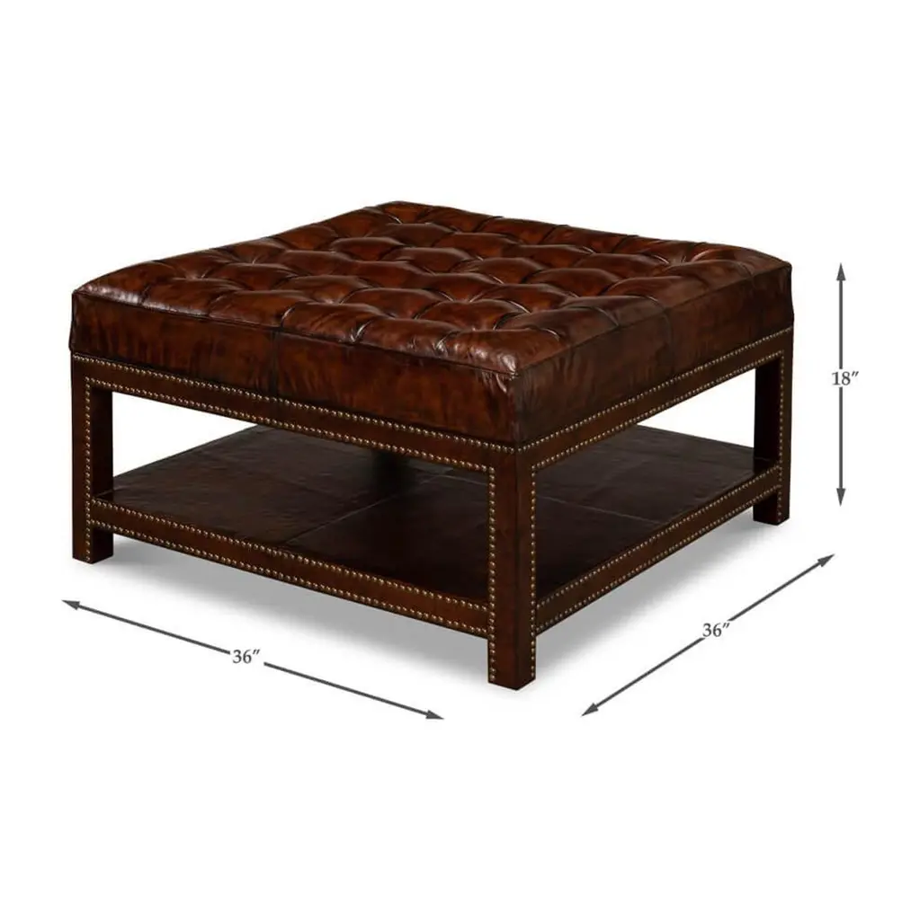 Vintage-style leather tufted ottoman in brown leather. It features a solid hardwood frame wrapped in rich brown leather detailed with nailhead brass trim. The cushioned top is fixed to the base with a tufted button pattern. Dimensions: 36" W x 36" D x 18" HSome color variation is common and acceptable on vintage-style leather.