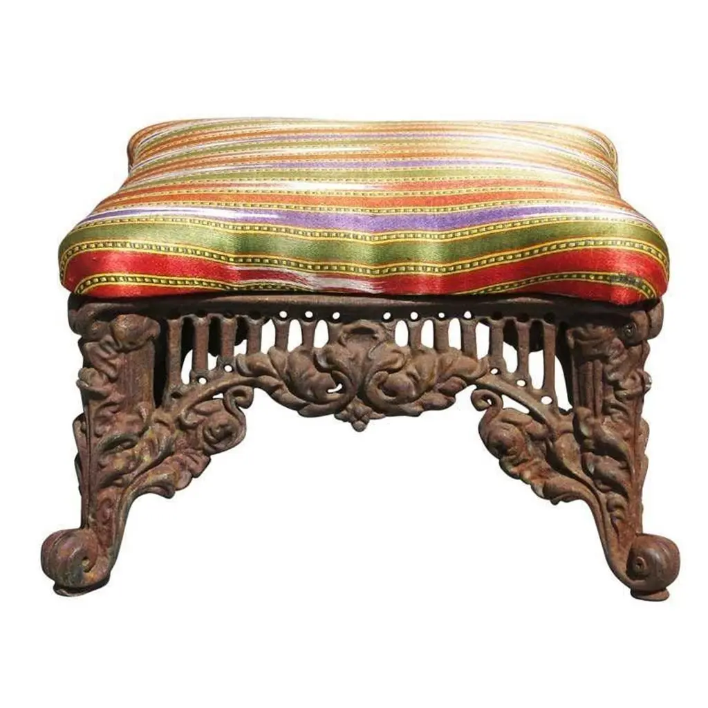 Gorgeous Victorian/Queen Anne Style cast iron foot stool with stripped multicolored fabric top.It measures approx.14" long each side and 8" tall. weighs approx. 14 lbs.3 available