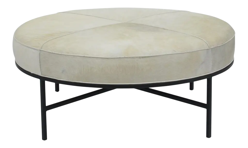White hide and matte black 'Tambour' round ottoman by Design Frères. Upholstered firm for use as an ottoman / coffee table. Great for dens / media rooms, with books, tray... or feet!